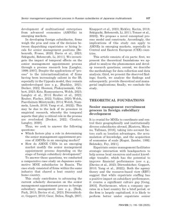 Purpose: this study explores determinants and temporal changes in the senior management appointment process in emerging markets, especially in transitional economies. Methodology: we organized a comparative case study of Japanese automotive firms’ subsidiaries in Russia, analyzing data through a process research lens. Findings: temporal effects in foreign subsidiary development impacted the senior management appointment process through evolving determinants. The determinants, such as HRM cost or expatriation advantages, varied in the middle and most recent stages, while speed advantages were prioritized in the early stage. Originality and contribution: scholars have previously discussed determinants in the senior management appointment process in foreign subsidiary development likely to impact the subsidiary’s performance. Yet, their debates have been largely dominated by institutional perspectives, lacking temporal framing. Therefore, this study advances scholarly discussions through the introduction of temporal aspects, whereby we present a novel process model and constructs.