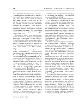 14. Kotelnikova Z., Radaev V. 2017. Recomposition and levelling of consumption expenditures across four economic shocks in Russia, 1994-2014. International Journal of Consumer Studies 41 (4): 439- 448. EDN: XNABWM