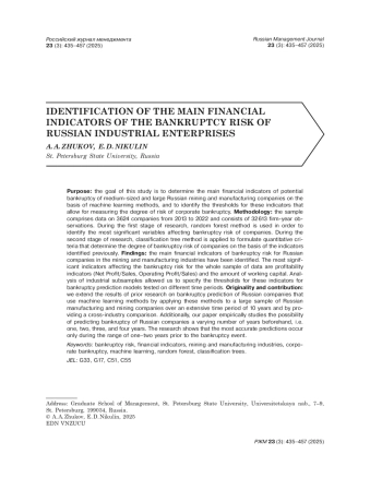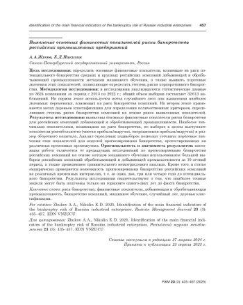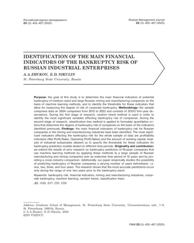 44. Zhukov A. A., Nikulin E. D., Shchuchkin D. A. 2022. Bankruptcy risk factors of Russian companies. Finance: Theory and Practice 26 (6): 131-155 (In Russian). EDN: ZDQHIY