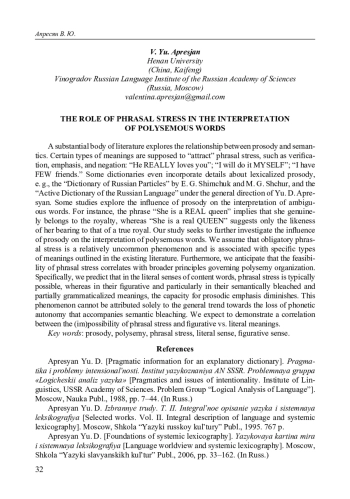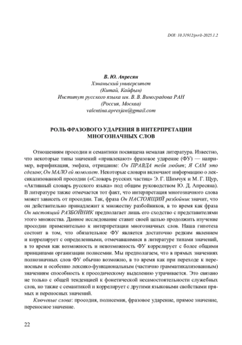 Отношениям просодии и семантики посвящена немалая литература. Известно, что некоторые типы значений «привлекают» фразовое ударение (ФУ) — например, верификация, эмфаза, отрицание: Он ПРАВДА тебя любит; Я САМ это с делаю; Он МАЛО ей помогает. Некоторые словари включают информацию о лексикализованной просодии («Словарь русских частиц» Э. Г. Шимчук и М. Г. Щур, «Активный словарь русского языка» под общим руководством Ю. Д. Апресяна). В литературе также отмечается тот факт, что интерпретация многозначного слова может зависеть от просодии. Так, фраза Он НАСТОЯЩИЙ разбойник значит, что он действительно принадлежит к множеству разбойников, в то время как фраза Он настоящий РАЗБОЙНИК предполагает лишь его сходство с представителями этого множества. Данное исследование ставит своей целью продолжить изучение просодии применительно к интерпретации многозначных слов. Наша гипотеза состоит в том, что обязательное ФУ является достаточно редким явлением и коррелирует с определенными, отмечавшимися в литературе типами значений, в то время как возможность и невозможность ФУ коррелирует с более общими принципами организации полисемии. Мы предполагаем, что в прямых значениях полнозначных слов ФУ обычно возможно, в то время как при переходе к переносным и особенно лексико-функциональным (частично грамматикализованным) значениям способность к просодическому выделению утрачивается. Это связано не только с общей тенденцией к фонетической несамостоятельности служебных слов, но также с семантикой и коррелирует с другими языковыми свойствами прямых и переносных значений