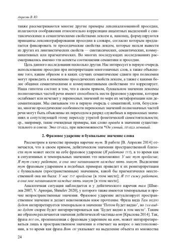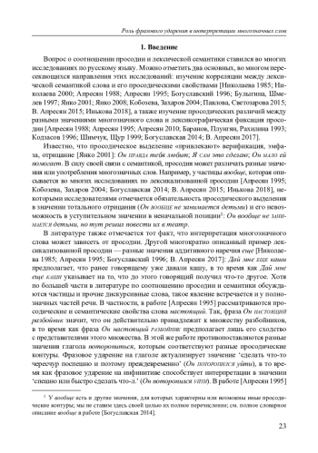 Вопрос о соотношении просодии и лексической семантики ставился во многих исследованиях по русскому языку. Можно отметить два основных, во многом пересекающихся направления этих исследований: изучение корреляции между лексической семантикой слова и его просодическими свойствами [Николаева 1985; Николаева 2000; Апресян 1988; Апресян 1995; Богуславский 1996; Булыгина, Шмелев 1997; Янко 2001; Янко 2008; Кобозева, Захаров 2004; Павлова, Светозарова 2015; В. Апресян 2015; Инькова 2018], а также изучение просодических различий между разными значениями многозначного слова и лексикографическая фиксация просодии [Апресян 1988; Апресян 1995; Апресян 2010; Баранов, Плунгян, Рахилина 1993; Кодзасов 1996; Шимчук, Щур 1999; Богуславская 2014; В. Апресян 2017]