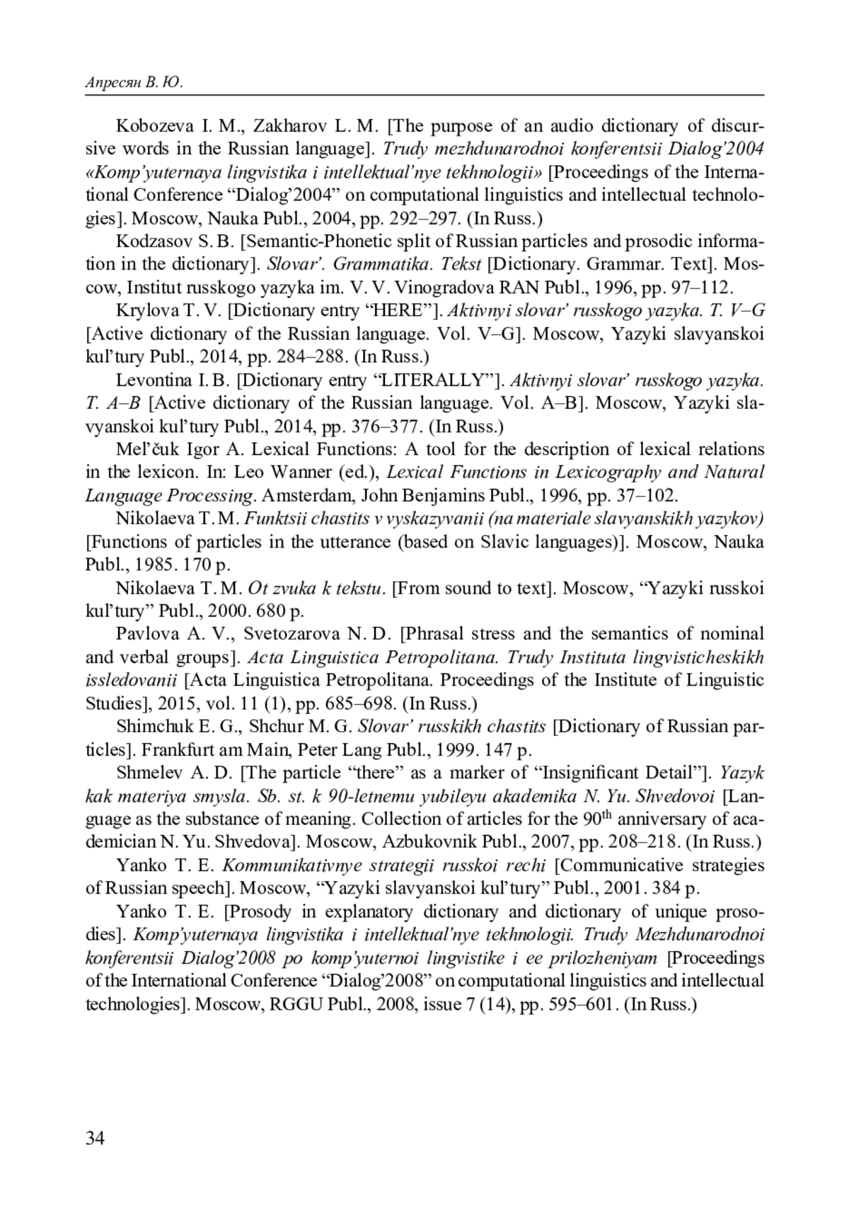 19. Кодзасов C. B. Семантико-фонетическое расщепление русских частиц и просодическая информация в словаре. // Словарь. Грамматика. Текст. М.: Ин-т русского языка им. В.В. Виноградова РАН, 1996. С. 97-112.