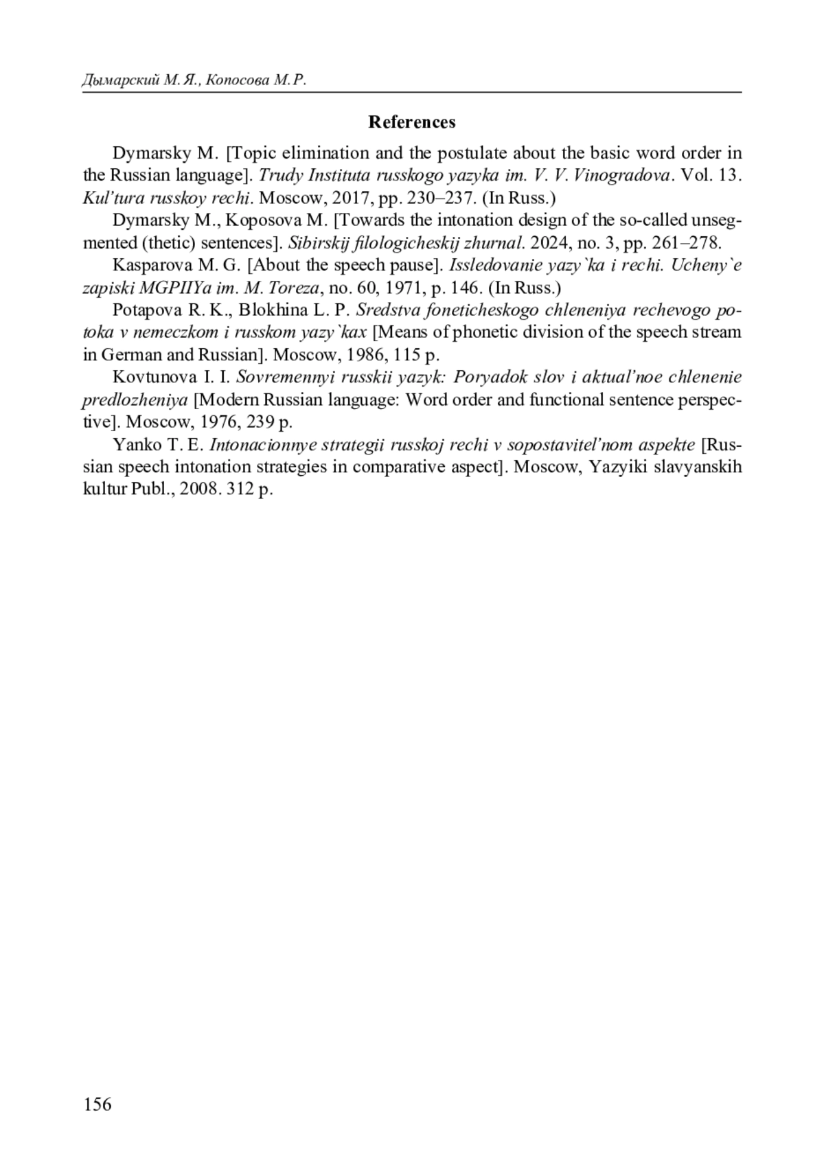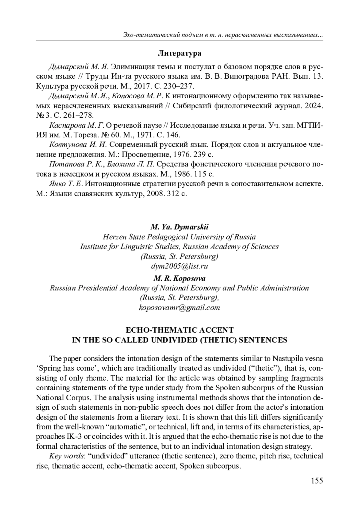 2. Дымарский М. Я., Копосова М. Р. К интонационному оформлению так называемых нерасчлененных высказываний // Сибирский филологический журнал. 2024 (в печати). EDN: GVJDNK
