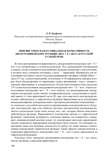 В статье рассматривается вариативность дискурсивной конструкции «вот + Х + вот» и ее употребление в устной русской речи. Под дискурсивной конструкцией в данном случае понимается выполняющее функции дискурсива словосочетание, в котором часть элементов постоянна, а часть — вариативна. Материалом для исследования послужили тексты полуструктурированных интервью (общий объем — около 97 тыс. словоупотреблений), полученные от 48 информантов, выборка которых была сбалансирована по параметрам «город проживания», «пол», «возраст», «уровень образования» и «специальность». В текстовом материале было выделено 174 случая использования дискурсивной конструкции «вот + Х + вот». Анализ использования конструкции «вот + Х + вот» показал, что рассматриваемая дискурсивная конструкция в речи обычно полифункциональна, а актуализация ее функций зависит от типа вариативной части (Х), при этом чаще всего конструкция выполняет дейктическую и эмфатическую функции. Вариативная часть конструкции весьма разнообразна: конструкция может заполняться различными компонентами — от отдельных слов любой части речи до предикативных конструкций (всего 45 разных заполнителей); при этом наиболее частыми заполнителями конструкции являются указательные слова этот, такой, так, это, которые обычно выполняют дейктическую функцию. Вариативность конструкции связана и с эмфатической функцией: стремление подчеркнуть отдельные важные для конкретного говорящего единицы речевой цепочки делает эту конструкцию настолько вариативной. Анализ социального варьирования конструкции в речи показал, что женщины существенно чаще, чем мужчины, используют ее в речи, что также связано с выполнением конструкцией эмфатической функции. Таким образом лингвистическая и социальная вариативность конструкции «вот + Х + вот» в речи определяется ее эмфатической функцией