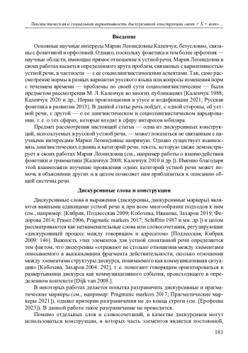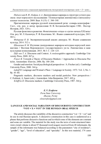 3. Ерофеева Е. В., Юшкова С. Е. Дискурсивные слова в устной спонтанной речи: социальное, индивидуальное и тематическое варьирование // Социо- и психолингвистические исследования. 2021. Вып. 9. С. 15-26. EDN: SFJNQC