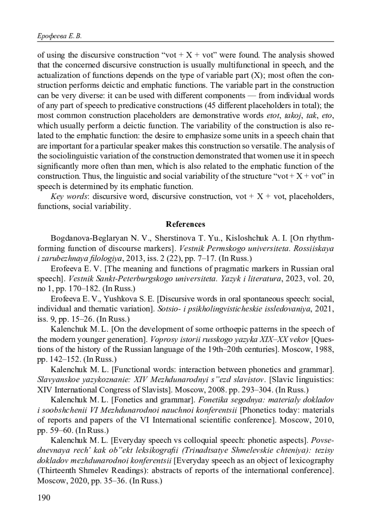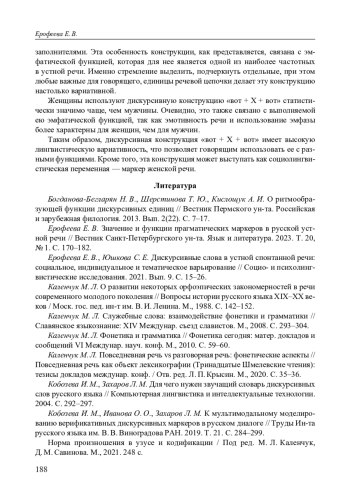 2. Ерофеева Е. В. Значение и функции прагматических маркеров в русской устной речи // Вестник Санкт-Петербургского ун-та. Язык и литература. 2023. Т. 20, № 1. С. 170-182. EDN: UBXDSK