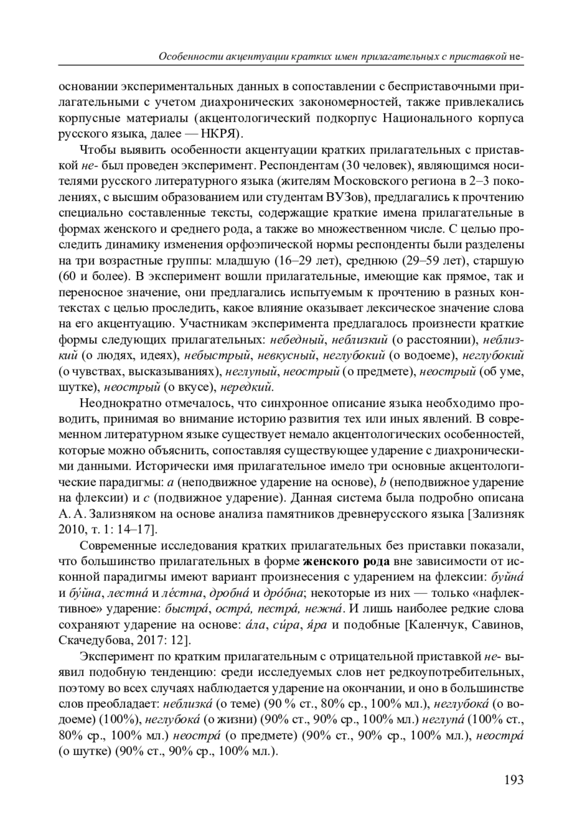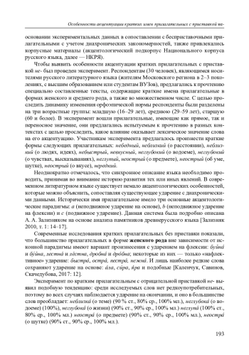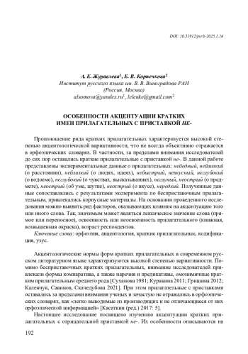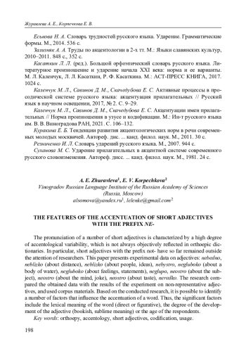 Произношение ряда кратких прилагательных характеризуется высокой степенью акцентологической вариативности, что не всегда объективно отражается в орфоэпических словарях. В частности, за пределами внимания исследователей до сих пор оставались краткие прилагательные с приставкой не-. В данной работе представлены экспериментальные данные о прилагательных: небедный, неблизкий (о расстоянии), неблизкий (о людях, идеях), небыстрый, невкусный, неглубокий (о водоеме), неглубокий (о чувствах, высказываниях), неглупый, неострый (о предмете), неострый (об уме, шутке), неострый (о вкусе), нередкий. Полученные данные сопоставлялись с результатами эксперимента по бесприставочным прилагательным, привлекались корпусные материалы. На основании проведенного исследования можно выявить ряд факторов, оказывающих влияние на акцентуацию того или иного слова. Так, значимым может являться лексическое значение слова (прямое или переносное), освоенность или неосвоенность прилагательного (книжная, возвышенная окраска), возраст респондентов