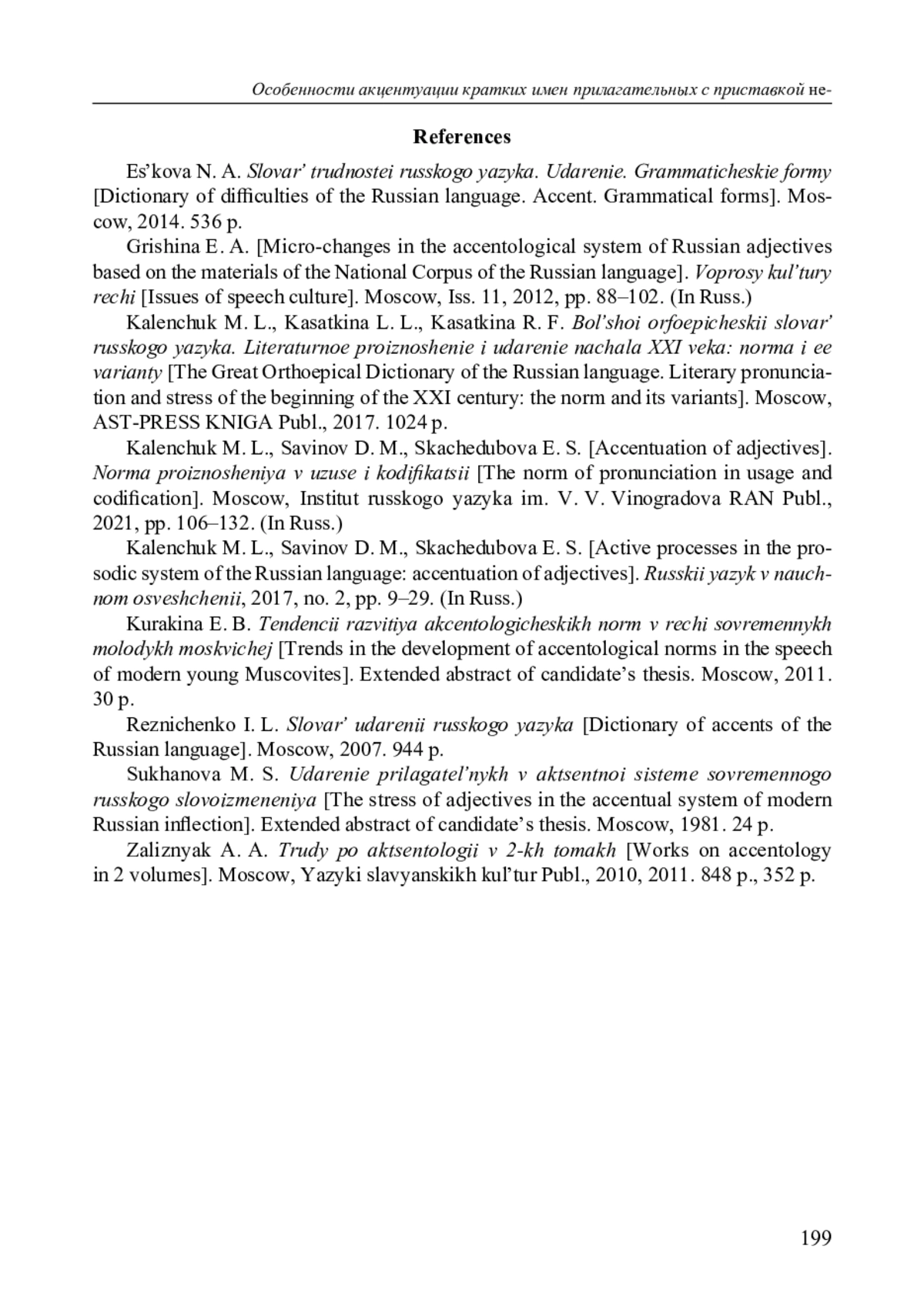 6. Каленчук М. Л., Савинов Д. М., Скачедубова Е. С. Акцентуации имен прилагательных // Норма произношения в узусе и кодификации. М.: Ин-т русского языка им. В. В. Виноградова РАН, 2021. С. 106-132. EDN: URGGGP