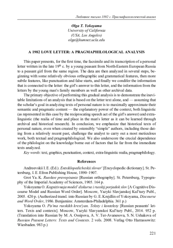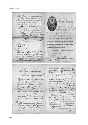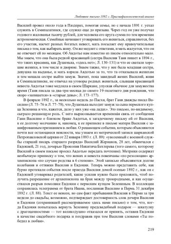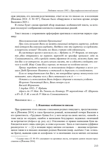 Письмо, факсимиле и транскрипция которого приводятся ниже, было написано молодым крестьянином Вятской губернии, отбывшим 4 года воинской повинности и достигшим чина старшего писаря старшего разряда. Адресат письма — крестьян- 213 ская девушка, его дальняя родственница; ответ ее на это письмо см. в коллекции [Йокояма 2014: Л. 84–85 1 ]. Письмо было обнаружено в частном архиве дочери Василия в 2023 г