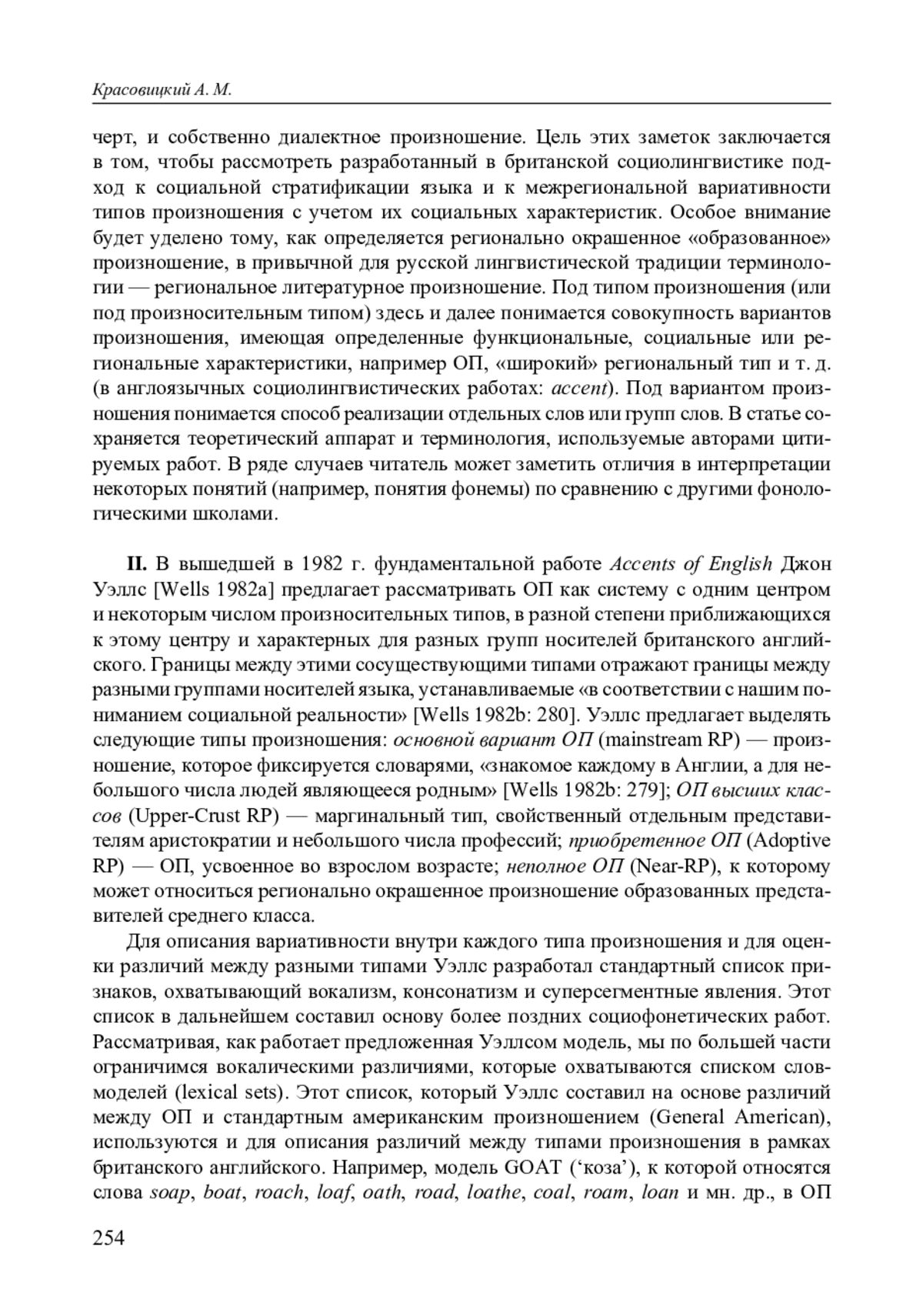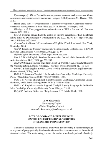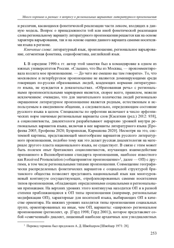 В статье анализируется опыт описания литературного языка как множества географически распределенных вариантов с единым центром — общенациональным вариантом. Рассматриваемая методика была разработана и успешно применена для описания социофонетической системы английского языка в Великобритании. Исследования британских социолингвистов показывают, как общенациональный стандарт — «общепринятое произношение» (Received Pronunciation) — может быть использован как основа для определения дифференциальных признаков всех социально распределенных типов произношения, характерных для той или иной географической области. Одновременно общенациональный стандарт используется как точка отсчета для описания регионального варьирования произношения различных социальных групп, включая произношение образованных носителей языка, опирающихся в ежедневной речевой практике на грамматические и лексические стандарты. Такое произношение, в ряде особенностей отличающееся от «общепринятого произношения», однако не включающее многие специфические региональные черты, рассматривается как региональный вариант «образованной речи», или, в принятой в русистике терминологии, — региональный вариант литературного произношения. Варианты произношения слов, характерные для этого типа, в отличие от других регионально ограниченных вариантов, включаются в произносительные словари со специальными пометами. Для выделения дифференциальных признаков того или иного типа произношения используется стандартный список произносительных слов-моделей, основанных на «общепринятом произношении». Каждая такая модель включает группу слов с одним и тем же звуковым сегментом, который варьируется на региональном или социальном уровне. Такая вариативность в реализации модели в различных социально или регионально ограниченных типах произношения оценивается с точки зрения природы характера различий. Это включает различия в составе аллофонов одной фонемы в данной модели, фонемном составе модели, фонотактике и различия, касающиеся фонетической реализации части лексем, входящих в данную модель. Вопрос о принадлежности той или иной фонетической реализации слова региональному варианту литературного произношения решается как на основе характера варьирования, так и на основе оценки данного варианта самими носителями языка в регионе.