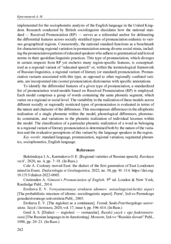 1. Букринская И. А., Кармакова О. Е. Региональные разновидности русской речи // Русская речь. 2020. № 4. С. 7-18. EDN: TWPVOD