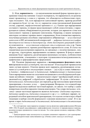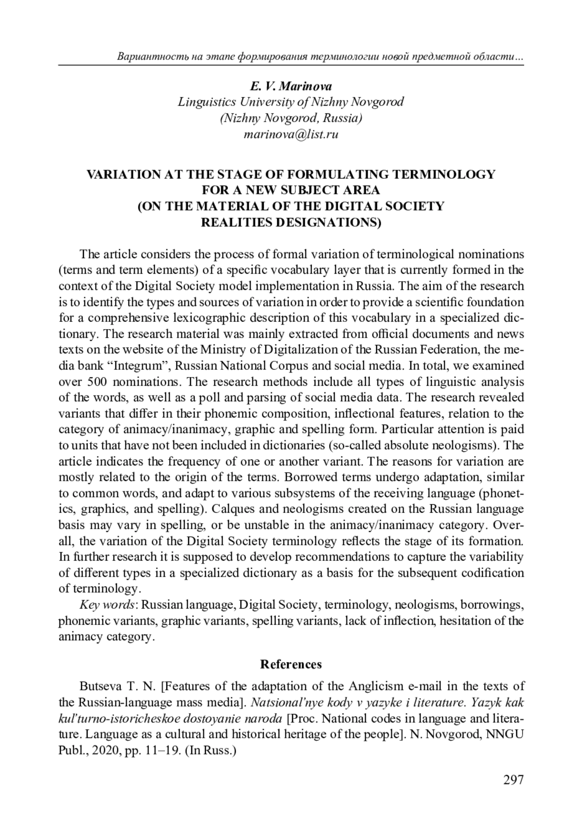 Рассматривается процесс формального варьирования терминологических номинаций (терминов и терминоэлементов) формирующегося в настоящее время особого пласта лексики, отражающего реализацию в стране модели цифрового общества. Цель исследования — определить типы и причины варьирования с тем, чтобы подготовить научную базу для полного лексикографического представления данной лексики в терминологическом словаре. Материал исследования в основном извлекался из официальных и новостных текстов, представленных на сайте Минцифры РФ, а также из электронного медиабанка «Интегрум», «Национального корпуса русского языка», соцсетей. Всего обследовано свыше 500 номинаций. Использовались: все виды языкового анализа слова, опрос респондентов, парсинг по соцсетям. В ходе исследования выявлены варианты, различающиеся фонемным составом, особенностями словоизменения, отношением к категории одушевленности/неодушевленности, графическим и орфографическим оформлением. Особо отмечаются единицы, не получившие кодификацию в словарях (абсолютные неологизмы). Указывается факт частотности того или иного варианта. Причины варьирования связаны в большинстве случаев с происхождением номинаций. Термины-заимствования претерпевают адаптацию подобно общеупотребительным словам, подстраиваясь к различным подсистемам принимающего языка (фонетике, графике и орфографии, словоизменению). Кальки и новообразования, созданные на русской почве, могут варьироваться в написании; некоторые проявляют колебания в категории одушевленности/ неодушевленности. В целом варьирование номинаций терминологии цифрового общества свидетельствует об этапе ее становления. В перспективе исследования предполагается разработать рекомендации для отражения вариантности разных типов в терминологическом словаре как базе для последующей кодификации терминологии