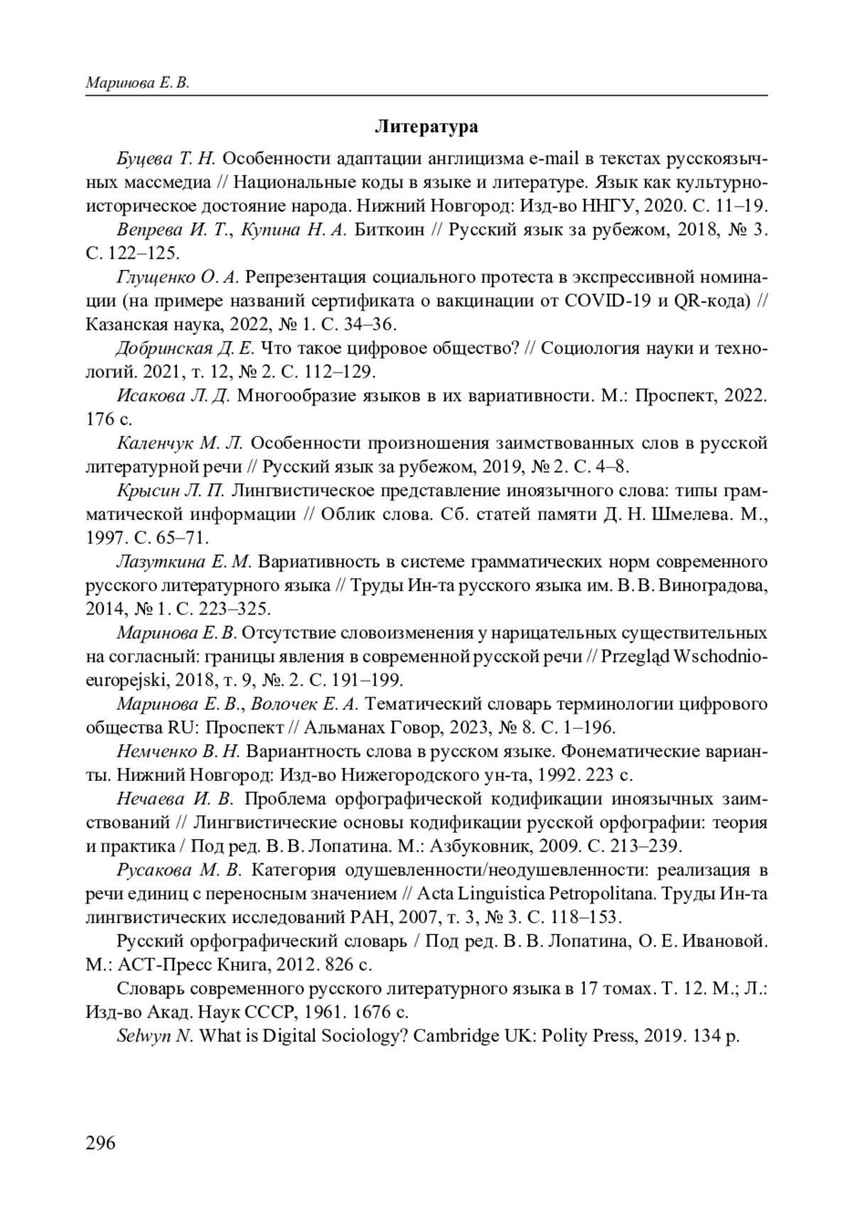 9. Маринова Е. В. Отсутствие словоизменения у нарицательных существительных на согласный: границы явления в современной русской речи // Przegląd Wschodnioeuropejski. 2018. Т. 9. №. 2. С. 191-199. EDN: ICSSAA
