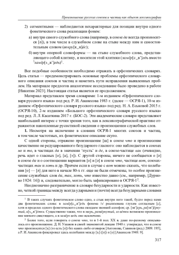 Цель статьи — продемонстрировать основные проблемы орфоэпического словарного описания союзов и частиц и наметить пути решения этих проблем. В орфоэпическом словаре сегментные особенности служебных слов, а также их безударность и колебания между безударностью и ударностью следует отражать последовательно — для всех служебных слов, у которых такие особенности представлены (колебания между [о] и [ə] в вот, что и др.). Нередко односложные союзы и частицы являются клитиками, и, поскольку фонемы могут по-разному вести себя на стыке клитики и ее носителя, эту информацию тоже необходимо фиксировать в орфоэпическом словаре: замёр[с‿в’]едь, ве[т’‿в]ы́шли и др. (считается, что произношение замёр[з‿в’]едь и ве[д’‿в]ы́шли нелитературно); на материале союзов и частиц это не было сделано ни в одном орфоэпическом словаре русского языка. В тех случаях, когда есть омонимы, их важно разграничивать; ср., например, союз что и местоимение что, фонетически отличающиеся друг от друга. Наконец, в русских орфоэпических словарях сегментные произносительные особенности некоторых союзов и частиц «спрятаны» в теоретической статье, приведенной после основной части словаря. Это должно быть исправлено: произносительные особенности служебных слов надо полноценно описывать не только в теоретической статье, но и в словарных статьях, посвященных им.
