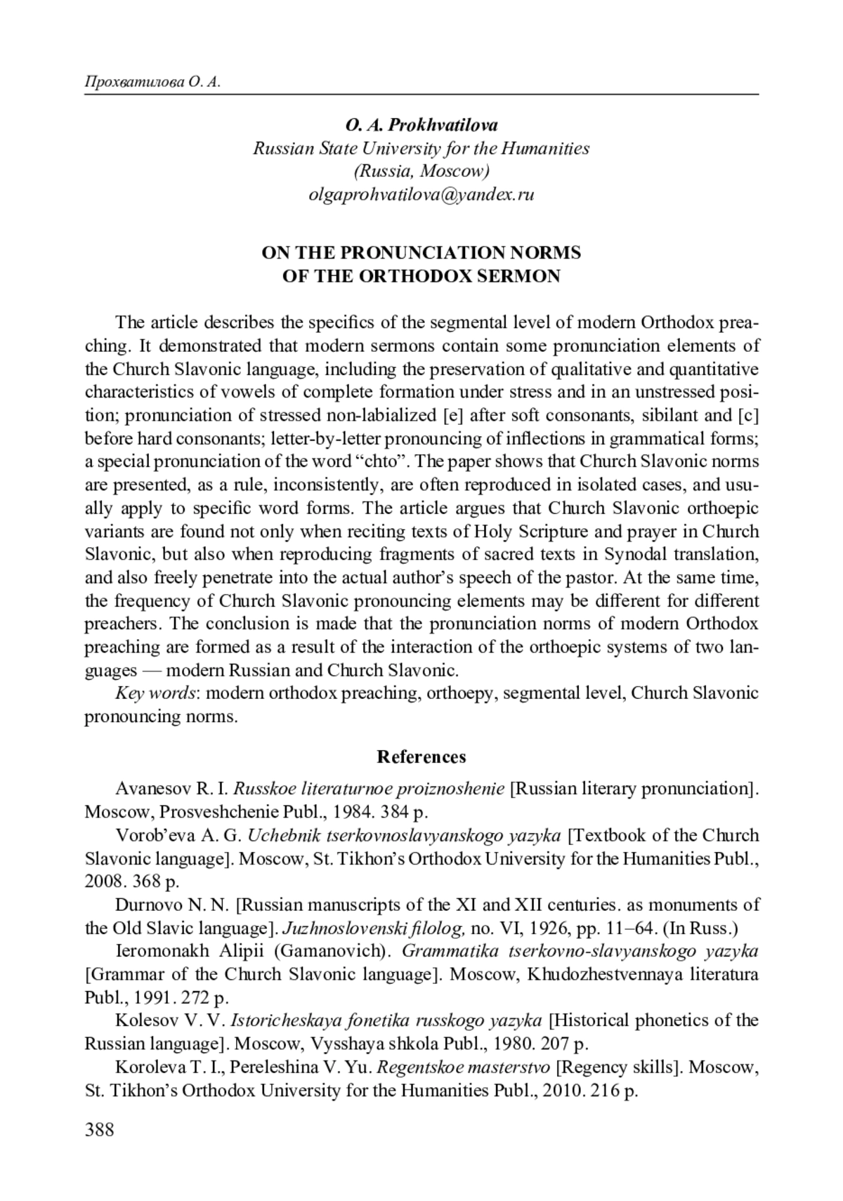 Как известно, феномен современной православной духовной речи состоит в том, что в ней функционируют тексты на церковнославянском языке (Священное Писание, молитвы, псалмы и др.) и речевые произведения на современном русском литературном языке, в числе которых проповеди, звучащие в храме и за его 380 пределами. Это обстоятельство формирует систему языковых средств духовной речи, пронизанную архаичными церковнославянскими элементами, которые в сочетании с единицами современного русского литературного языка создают ее стилистическое своеобразие. В данной статье предлагается описание сегментного уровня православной проповеди в орфоэпическом аспекте — с точки зрения актуальности для звучания проповеди норм церковнославянского произношения.