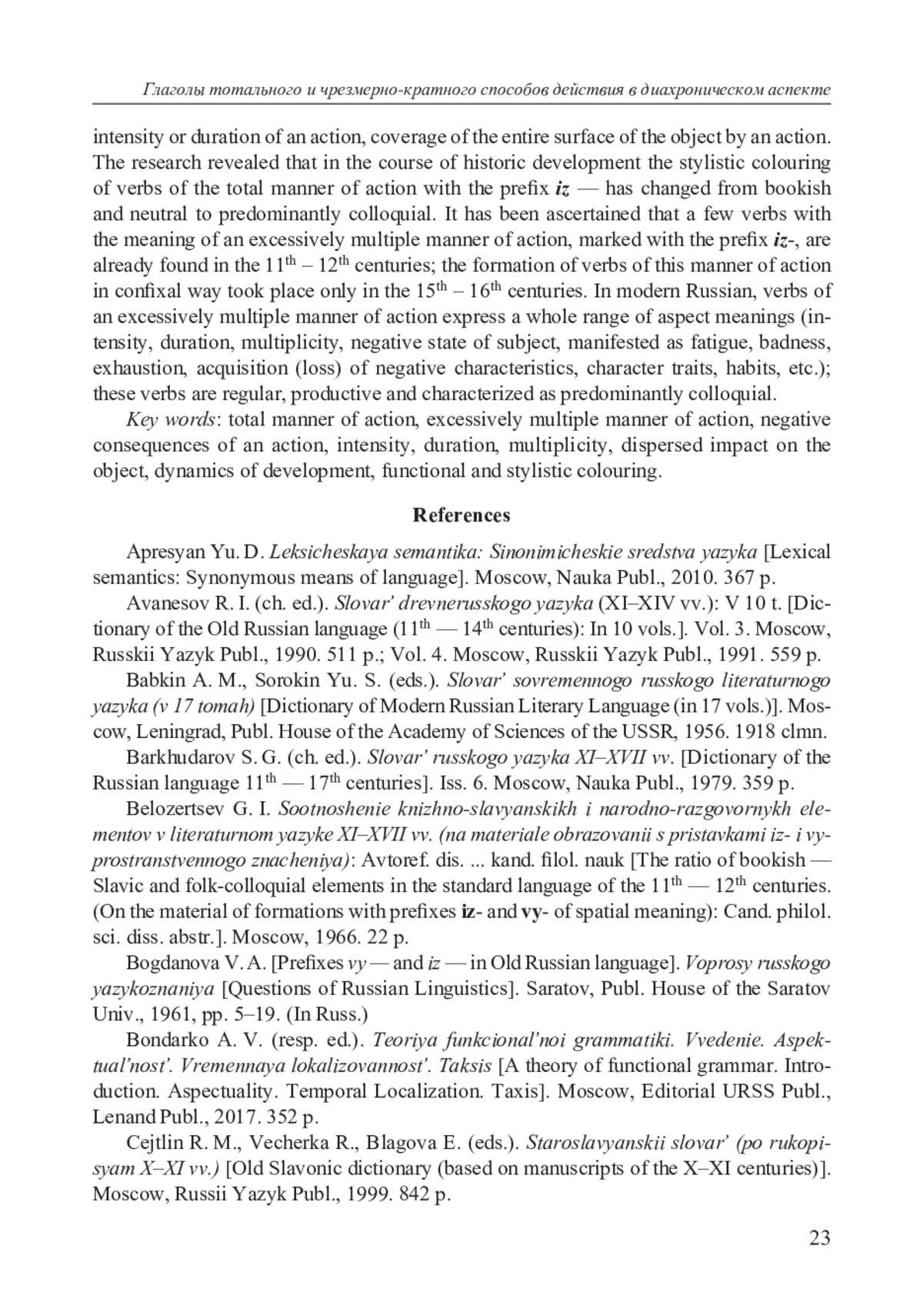 В статье рассматривается история возникновения значений тотального и чрез мерно-кратного способов действия, выражаемых приставкой из- и конфиксом из-…-ся, динамика их развития с XI в. по настоящее время. Интерес к этим способам глагольного действия обусловлен тем, что они выражают целый комплекс акциональных значений (интенсивность, длительность, часто кратность, рассредоточенное воздействие на объект, негативный результат), отличаются стилистической маркированностью, выразительностью, регулярностью функционирования в современном русском языке. В качестве материала для исследования послужили данные исторических словарей, а также Национального корпуса русского языка. Установлено, что истоки тотального способа действия уходят в праславянскую эпоху, в древнерусском языке эти глаголы появляются в результате семантического и морфемного словообразования; в старорусском языке количество их значительно увеличивается за счет расширения семантических разрядов базовых глаголов. В современном русском языке словообразовательные типы, соответствующие этому способу действия, являются продуктивными и регулярными. Выявлено, что немногочисленные глаголы со значением чрезмерно-кратного способа действия, маркированные конфиксом из-…-ся, встречаются уже в XI–XII вв. Образование глаголов этого способа действия именно конфиксальным способом стало происходить только с XV–XVI вв. В современном русском языке глаголы чрезмернократного способа действия выражают целый комплекс аспектуальных значений (интенсивность, длительность, кратность, отрицательное состояние субъекта, проявляемое как утомление, негодность, исчерпанность, приобретение (утрата) негативных особенностей, черт характера, привычек и т. д.); эти глаголы регулярны, продуктивны, характеризуются преимущественно разговорной окраской