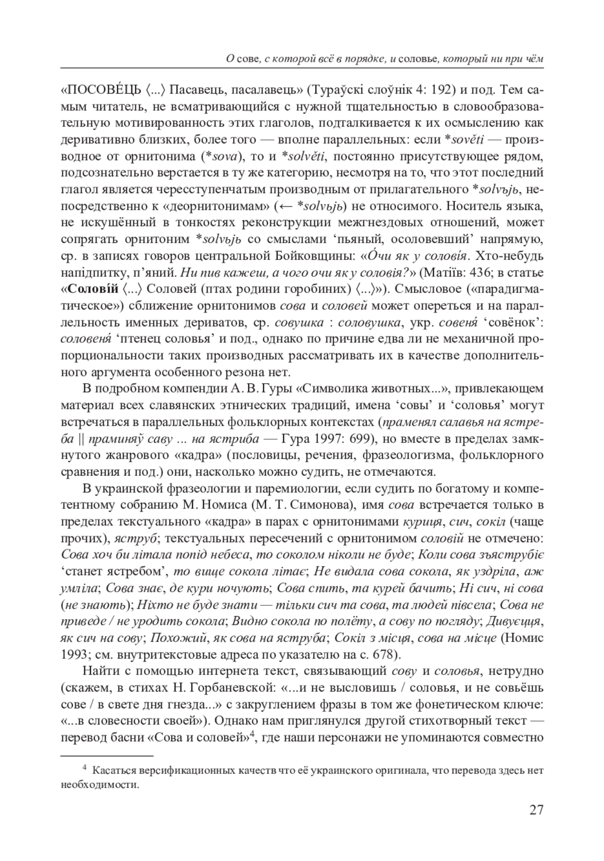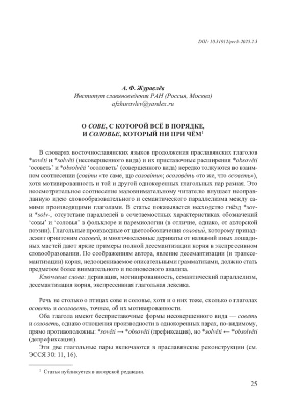 В словарях восточнославянских языков продолжения праславянских глаголов *sověti и *solvěti (несовершенного вида) и их приставочные расширения *obsověti ‘осоветь’ и *obsolvěti ‘осоловеть’ (совершенного вида) нередко толкуются во взаимном соотнесении (совiти «те саме, що соловíти»; осоловéть «то же, что осоветь»), хотя мотивированность и той и другой однокоренных глагольных пар разная. Это неосмотрительное соотнесение маловнимательному читателю внушает неоправданную идею словообразовательного и семантического параллелизма между самими производящими глаголами. В статье показывается несходство гнёзд *sovи *solv-, отсутствие параллелей в сочетаемостных характеристиках обозначений ‘совы’ и ‘соловья’ в фольклоре и паремиологии (в отличие, однако, от авторской поэзии). Глагольные производные от цветообозначения соловый, которому принадлежит орнитоним соловей, и многочисленные дериваты от названий иных лошадиных мастей дают яркие примеры полной десемантизации корня в экспрессивном словообразовании. По соображениям автора, явление десемантизации (и транссемантизации) корня, недооцениваемое описательными грамматиками, должно стать предметом более внимательного и полновесного анализа