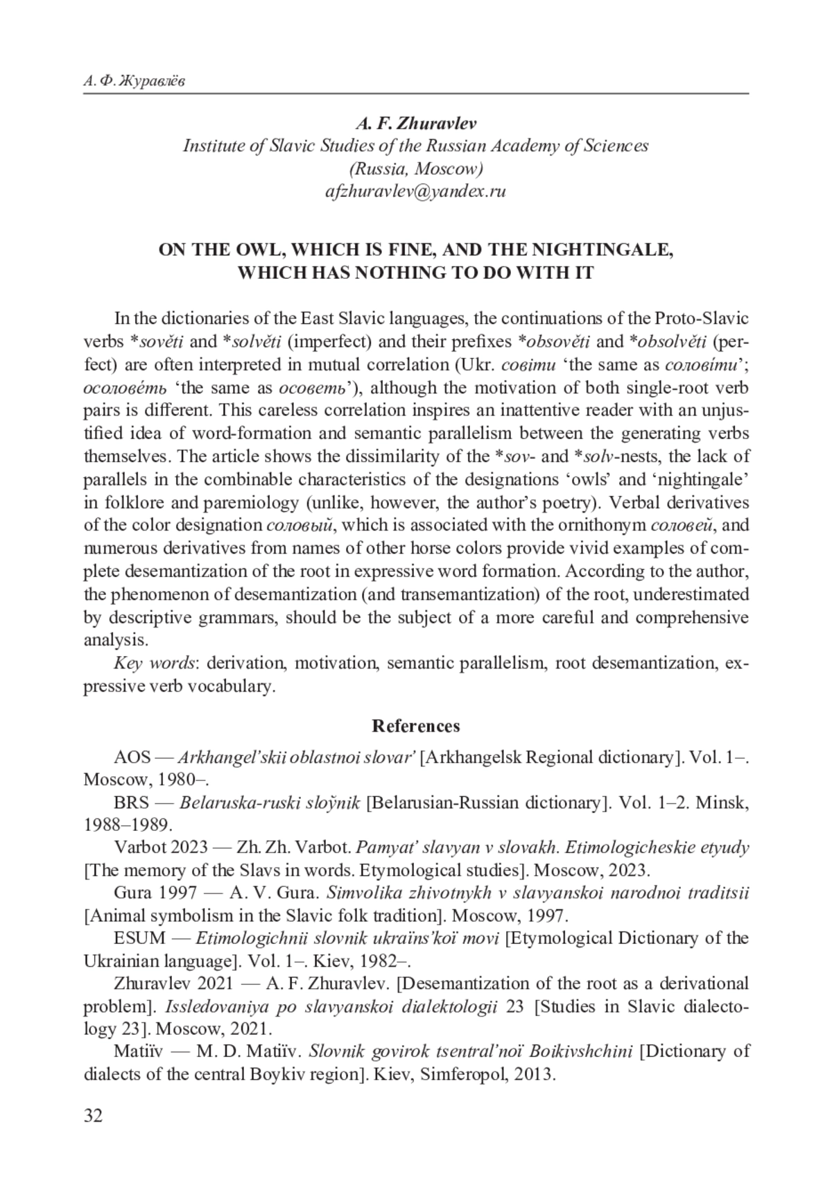 8. Журавлёв 2021 - А. Ф. Журавлёв. Десемантизация корня как дериватологическая проблема // Исследования по славянской диалектологии 23. М., 2021.