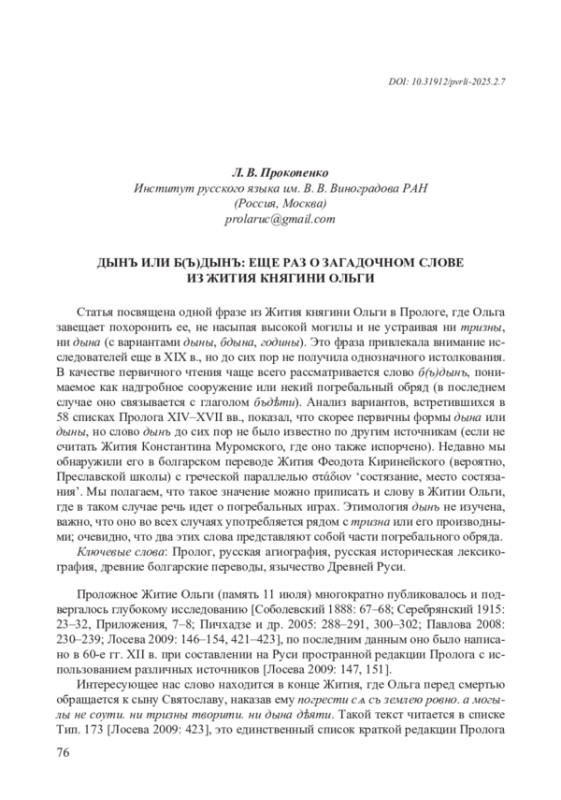 Статья посвящена одной фразе из Жития княгини Ольги в Прологе, где Ольга завещает похоронить ее, не насыпая высокой могилы и не устраивая ни тризны, ни дына (с вариантами дыны, бдына, годины). Это фраза привлекала внимание исследователей еще в XIX в., но до сих пор не получила однозначного истолкования. В качестве первичного чтения чаще всего рассматривается слово б(ъ)дынъ, понимаемое как надгробное сооружение или некий погребальный обряд (в последнем случае оно связывается с глаголом бъдѣти). Анализ вариантов, встретившихся в 58 списках Пролога XIV–XVII вв., показал, что скорее первичны формы дына или дыны, но слово дынъ до сих пор не было известно по другим источникам (если не считать Жития Константина Муромского, где оно также испорчено). Недавно мы обнаружили его в болгарском переводе Жития Феодота Киринейского (вероятно, Преславской школы) с греческой параллелью στάδιον ‘состязание, место состязания’. Мы полагаем, что такое значение можно приписать и слову в Житии Ольги, где в таком случае речь идет о погребальных играх. Этимология дынъ не изучена, важно, что оно во всех случаях употребляется рядом с тризна или его производными; очевидно, что два этих слова представляют собой части погребального обряда