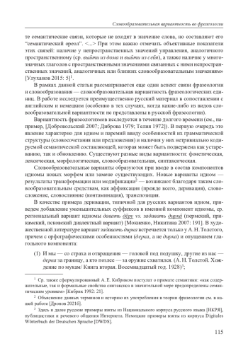 Вариантность фразеологических (прежде всего, идиом) представлена на фонетическом, морфемном, лексическом и синтаксическом ярусах, причем как в «чистом», так и в смешанном виде. В рамках данной статьи рассматривается такой аспект связи фразеологии и словообразования, как словообразовательная вариантность фразеологических единиц. Анализируется преимущественно русский материал в сопоставлении с английским и немецким (особенно в тех случаях, когда какие-либо из видов словообразовательной вариантности не представлены в русской фразеологии). Среди словообразовательных вариантов выделяются дериваты, композиты, контаминации (преимущественно игровые), транспозитивные преобразования. Эти варианты могут иметь различную продуктивность в зависимости от грамматики языка: так, если в языке продуктивно словосложение, возможны и варианты идиом, созданные с его помощью. Словообразовательные варианты меняют и план выражения, и план содержания идиомы. Они связаны с другими видами вариантности на разных ярусах языка, в частности лексической, морфологической, синтаксической (в частности, контаминация идиом бывает не только словообразовательной, но также лексической и лексико-синтаксической). Конечным результатом вариантности, в том числе словообразовательной, становится образование новой автономной единицы, которая лишь отчасти связана с исходной