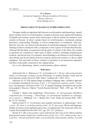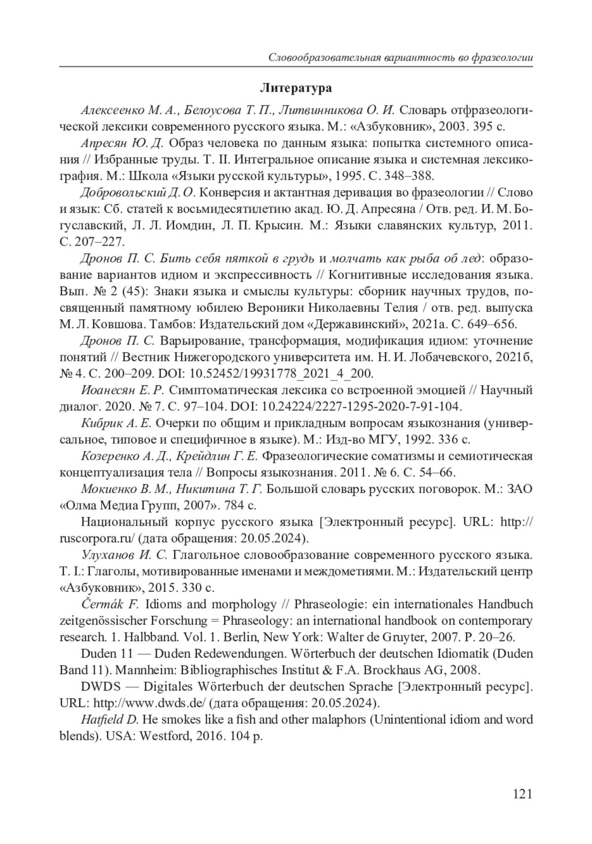 5. Дронов П. С. Варьирование, трансформация, модификация идиом: уточнение понятий // Вестник Нижегородского университета им. Н. И. Лобачевского, 2021б, № 4. С. 200-209. DOI: 10.52452/19931778_2021_4_200
