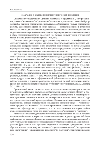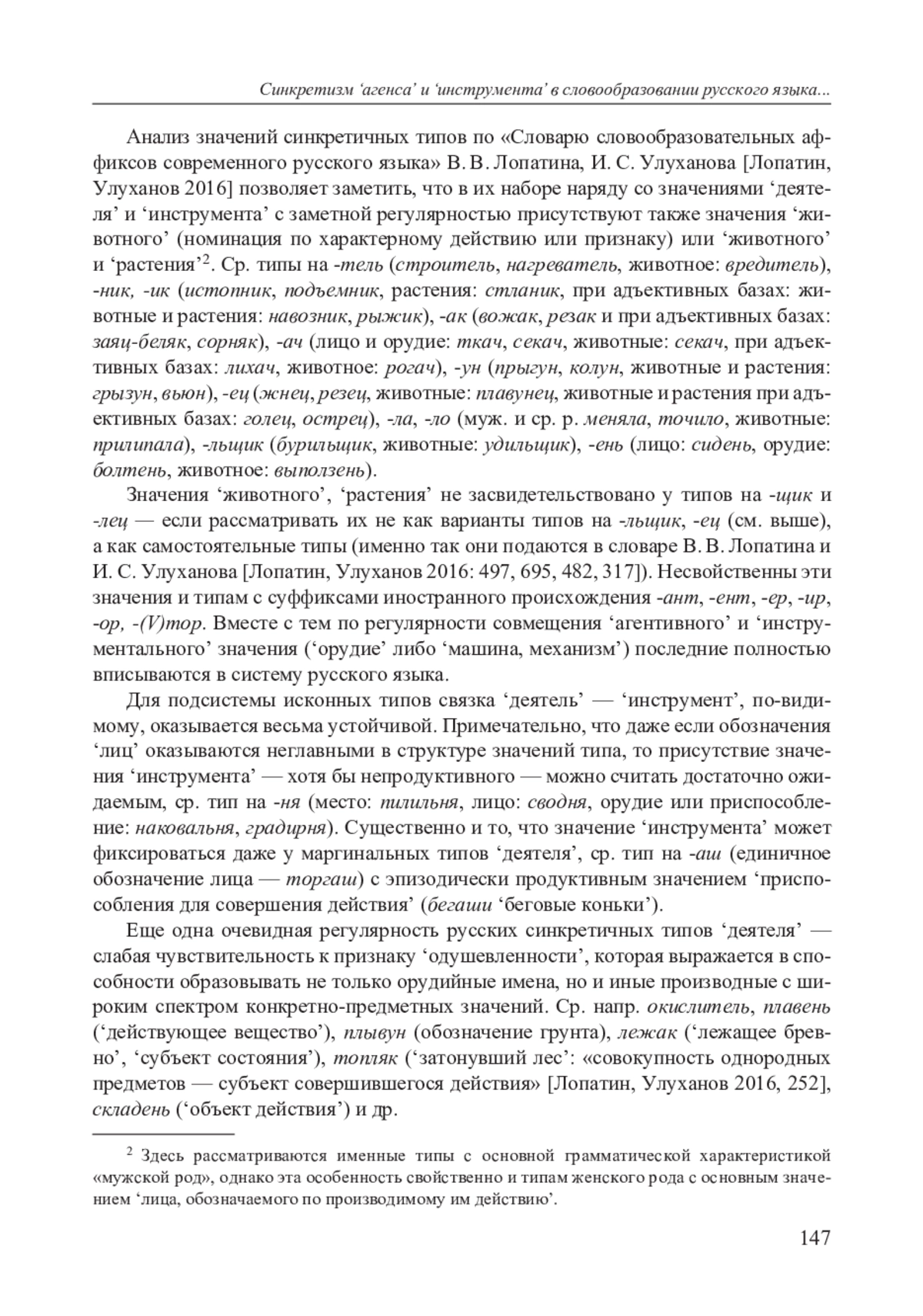 В статье анализируется место в системе словообразования русского языка словообразовательных типов с очевидным совмещением значений ‘агенса’ (‘деятеля’) и ‘инструмента’ (синкретичных типов), с одной стороны, и типов имен ‘деятеля’ без подобного совмещения (несинкретичных типов) — с другой. Показывается, что словообразовательные типы ‘деятеля’, которым несвойственно значение ‘инструмента’, обладают особыми признаками. В системе русского именного словообразования они вытесняются на периферию: во-первых, в основном они непродуктивны или маргинальны; во-вторых, их преобладающая часть составляет грамматически обособленную группу с признаком ‘общего рода’, в-третьих, если для них и фиксируются отдельные производные с конкретным значением, то они, как правило, имеют не значение ‘орудия’, а общее значение ‘предмета’. Присутствие системных дополнительных значений ‘животных’, ‘растений’ и ‘вещей’ у типов имен ‘деятеля’ рассматривается как типологическая характеристика, в частности, отличающая русский язык от соседних алтайских языков, и в наибольшей степени сближающая его с индоевропейскими балтийскими языками. Широкий спектр конкретных значений русских типов имен ‘деятеля’ означает доминацию принципа максимального абстрагирования: единое маркирование в системе могут получать любые конкретно-предметные сущности независимо от признака ‘одушевленности’ или ‘неодушевленности’.