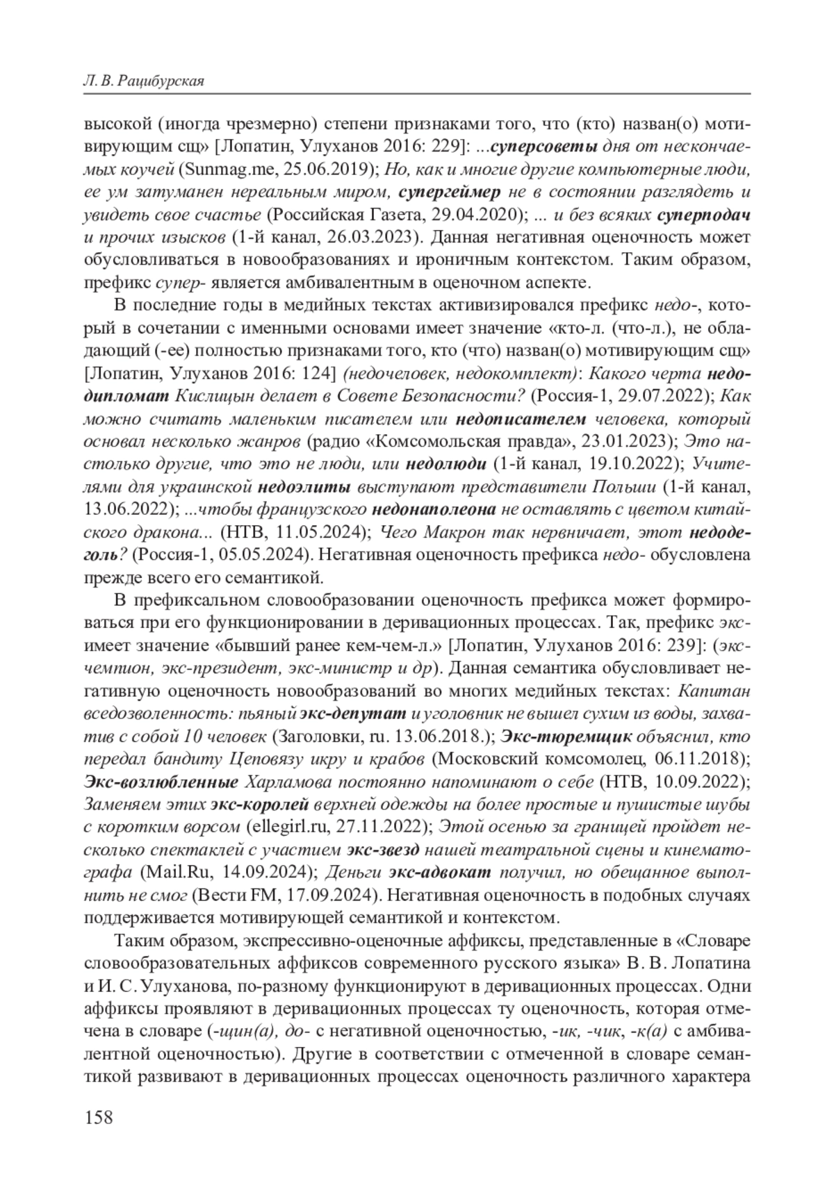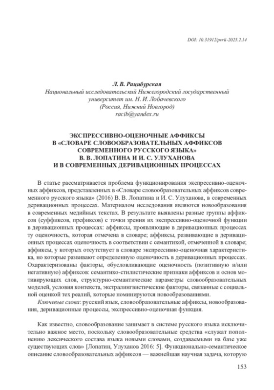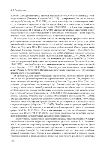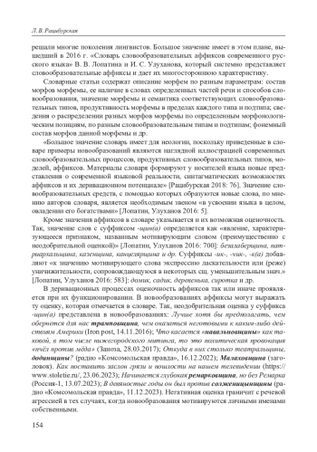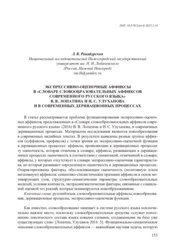 Как известно, словообразование занимает в системе русского языка исключительно важное место, поскольку словообразовательные средства «служат пополнению лексического состава языка новыми словами, создаваемыми на базе уже существующих слов» [Лопатин, Улуханов 2016: 5]. Функционально-семантическое описание словообразовательных аффиксов — важнейшая научная задача, которую 154 решали многие поколения лингвистов. Большое значение имеет в этом плане, вышедший в 2016 г. «Словарь словообразовательных аффиксов современного русского языка» В. В. Лопатина и И. С. Улуханова, который системно представляет словообразовательные аффиксы и дает их многостороннюю характеристику.