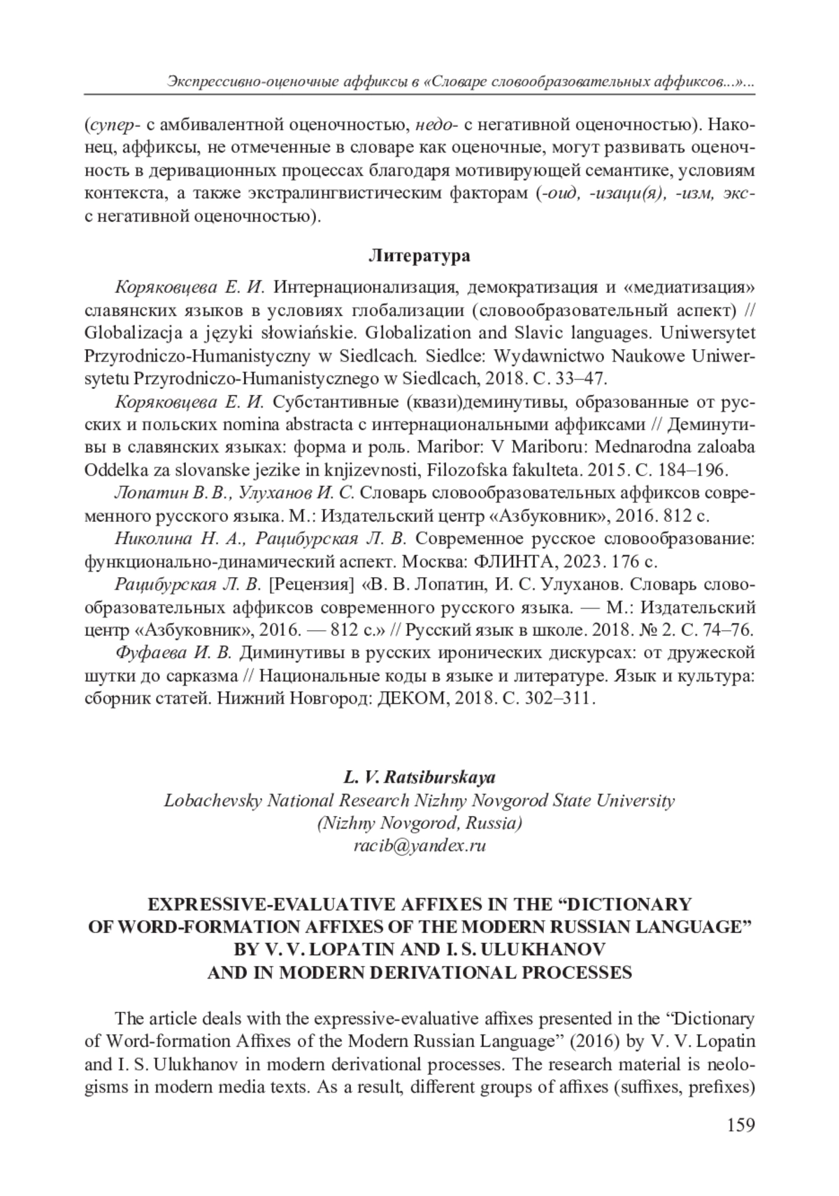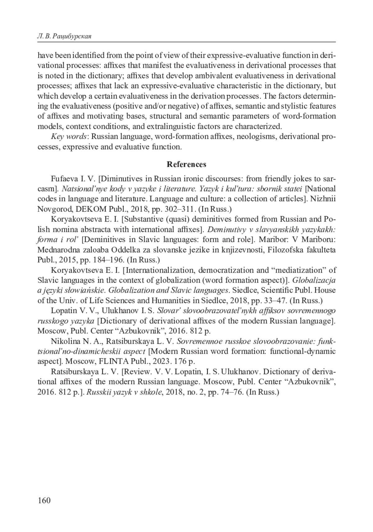 1. Коряковцева Е. И. Интернационализация, демократизация и “медиатизация” славянских языков в условиях глобализации (словообразовательный аспект) // Globalizacja a języki słowiańskie. Globalization and Slavic languages. Uniwersytet Przyrodniczo-Humanistyczny w Siedlcach. Siedlce: Wydawnictwo Naukowe Uniwersytetu Przyrodniczo-Humanistycznego w Siedlcach, 2018. С. 33-47.