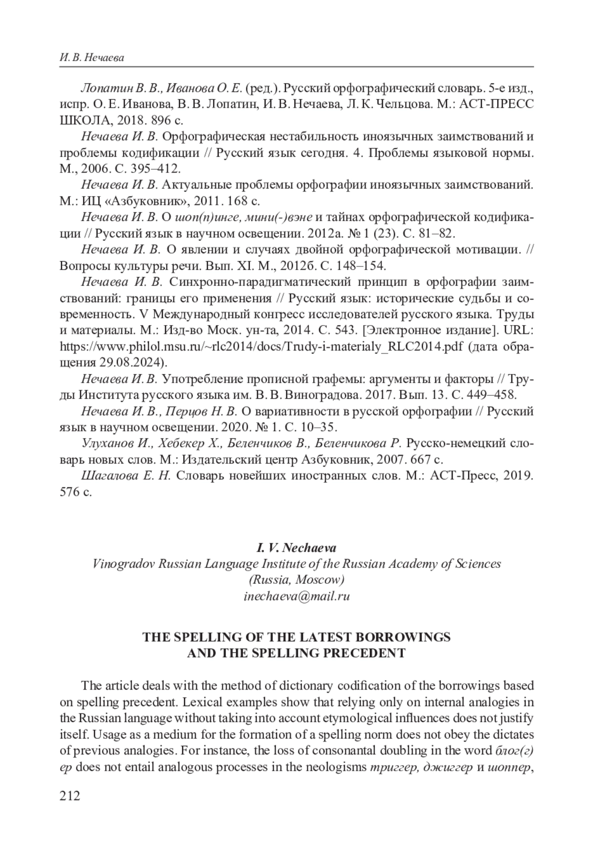 17. Нечаева И. В. Синхронно-парадигматический принцип в орфографии заимствований: границы его применения // Русский язык: исторические судьбы и современность. V Международный конгресс исследователей русского языка. Труды и материалы. М.: Изд-во Моск. ун-та, 2014. С. 543. [Электронное издание]. URL: https://www.philol.msu.ru/~rlc2014/docs/Trudy-i-materialy_RLC2014.pdf (дата обращения 29.08.2024). EDN: SCBEFT