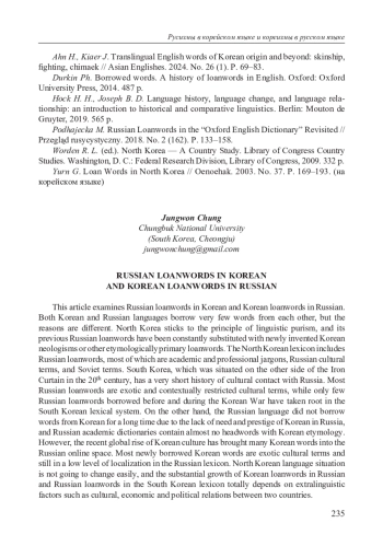 В статье рассматриваются русизмы в корейском языке и кореизмы в русском языке. Оба языка заимствуют очень мало слов друг у друга, но причины этого различны. Северная Корея соблюдает принцип лингвистического пуризма, и ранее заимствованные русские слова постоянно заменяются вновь созданными корейскими неологизмами или другими заимствованиями с первичной этимологией. В число русизмов северокорейского языка входят прежде всего научные и профессиональные жаргоны, советизмы и слова, специфичные для русской культуры. А Южная Корея, находившаяся на другой стороне железного занавеса в XX в., имеет очень короткую историю культурных контактов с Россией. Большинство русизмов южнокорейского языка является экзотическими и контекстуально ограниченными культурными словами, тогда как только очень мало русизмов, заимствованных перед или во время Корейской войны, укоренились в южнокорейской лексической системе. С другой стороны, русский язык долгое время не заимствовал слова из корейского из-за отсутствия необходимости и низкого престижа корейского языка в России, и академические словари русского языка до сих пор почти не содержат заглавных слов корейского происхождения. Однако рост всемирной популярности корейской культуры за последние годы привел к появлению многих корейских слов в русскоязычной сети. Большинство из этих новых заимствований являются экзотическими культурными словами и имеют низкий уровень освоения в русской языковой системе. Лингвистическая ситуация в Северной Корее легко не изменится, а существенный рост кореизмов в русском и русизмов в южнокорейском полностью зависит от экстралингвистических факторов, таких как культурные, экономические, политические отношения двух стран