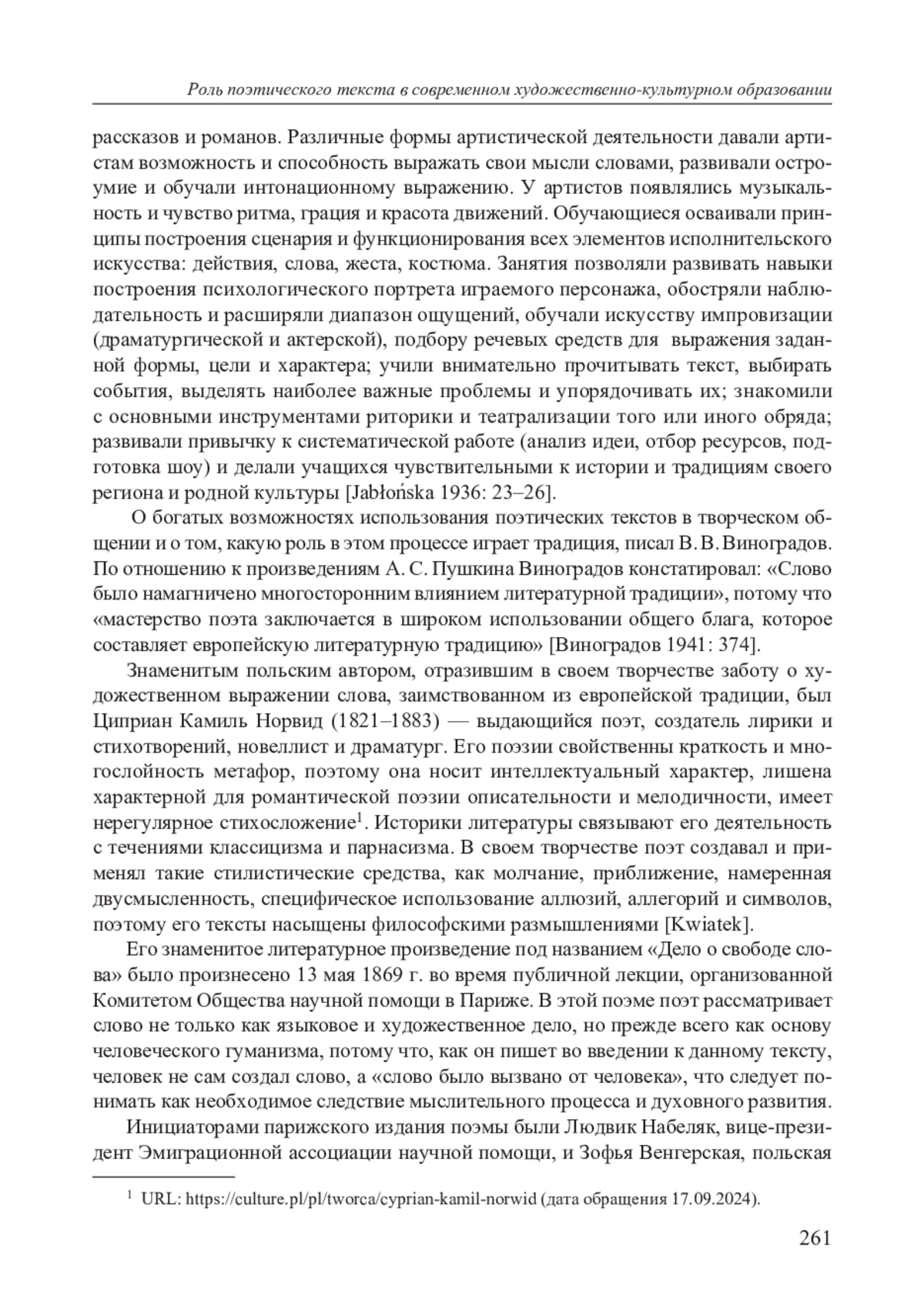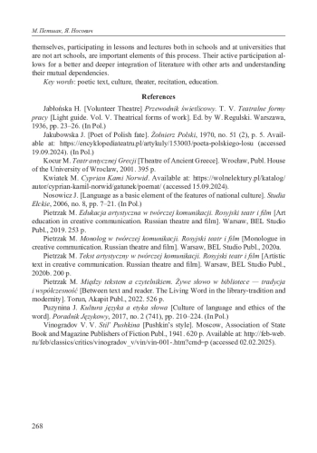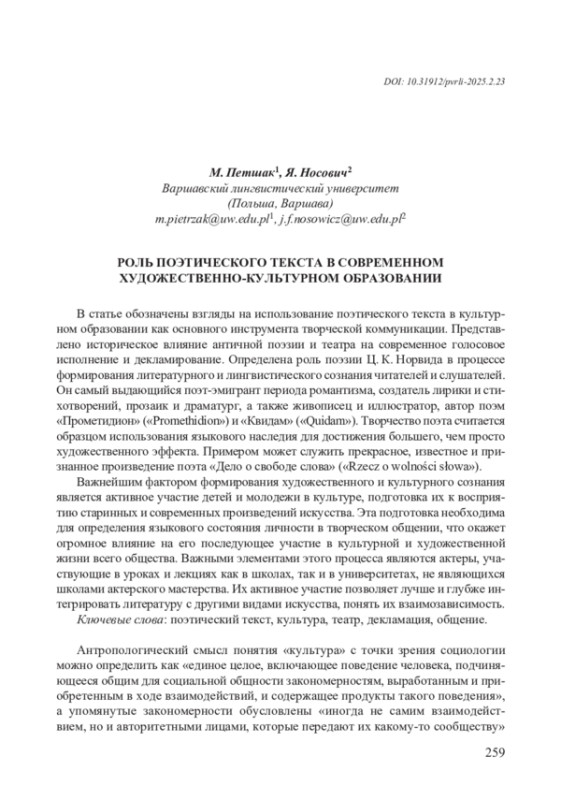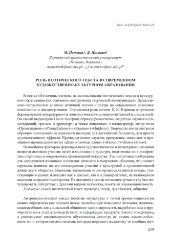 В статье обозначены взгляды на использование поэтического текста в культурном образовании как основного инструмента творческой коммуникации. Представлено историческое влияние античной поэзии и театра на современное голосовое исполнение и декламирование. Определена роль поэзии Ц. К. Норвида в процессе формирования литературного и лингвистического сознания читателей и слушателей. Он самый выдающийся поэт-эмигрант периода романтизма, создатель лирики и стихотворений, прозаик и драматург, а также живописец и иллюстратор, автор поэм «Прометидион» («Promethidion») и «Квидам» («Quidam»). Творчество поэта считается образцом использования языкового наследия для достижения большего, чем просто художественного эффекта. Примером может служить прекрасное, известное и признанное произведение поэта «Дело о свободе словa» («Rzecz o wolności słowa»). Важнейшим фактором формирования художественного и культурного сознания является активное участие детей и молодежи в культуре, подготовка их к восприятию старинных и современных произведений искусства. Эта подготовка необходима для определения языкового состояния личности в творческом общении, что окажет огромное влияние на его последующее участие в культурной и художественной жизни всего общества. Важными элементами этого процесса являются актеры, участвующие в уроках и лекциях как в школах, так и в университетах, не являющихся школами актерского мастерства. Их активное участие позволяет лучше и глубже интегрировать литературу с другими видами искусства, понять их взаимозависимость