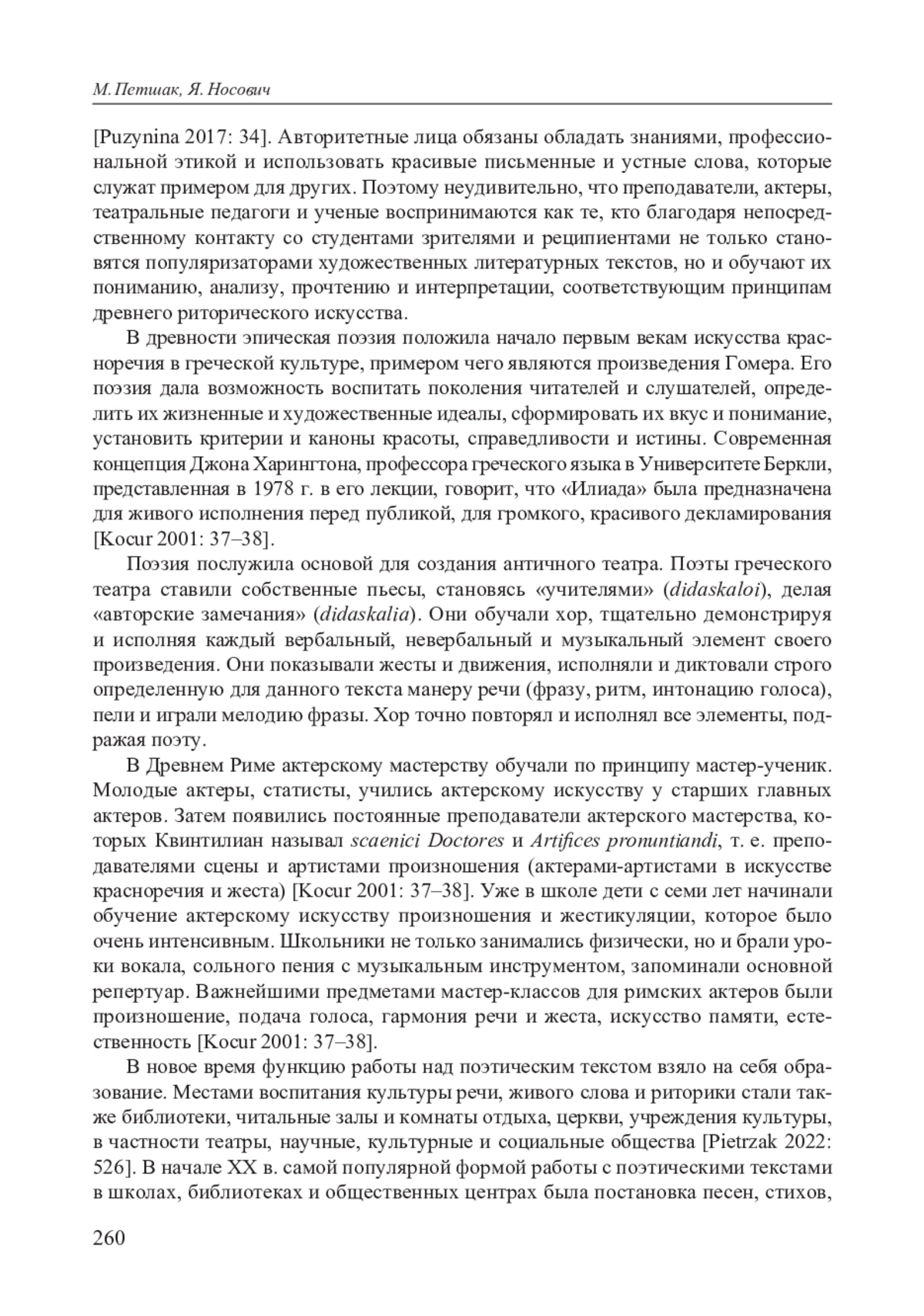 Антропологический смысл понятия «культура» с точки зрения социологии можно определить как «единое целое, включающее поведение человека, подчиняющееся общим для социальной общности закономерностям, выработанным и приобретенным в ходе взаимодействий, и содержащее продукты такого поведения», а упомянутые закономерности обусловлены «иногда не самим взаимодействием, но и авторитетными лицами, которые передают их какому-то сообществу» 260 [Puzynina 2017: 34]. Авторитетные лица обязаны обладать знаниями, профессиональной этикой и использовать красивые письменные и устные слова, которые служат примером для других. Поэтому неудивительно, что преподаватели, актеры, театральные педагоги и ученые воспринимаются как те, кто благодаря непосредственному контакту со студентами зрителями и реципиентами не только становятся популяризаторами художественных литературных текстов, но и обучают их пониманию, анализу, прочтению и интерпретации, соответствующим принципам древнего риторического искусства.