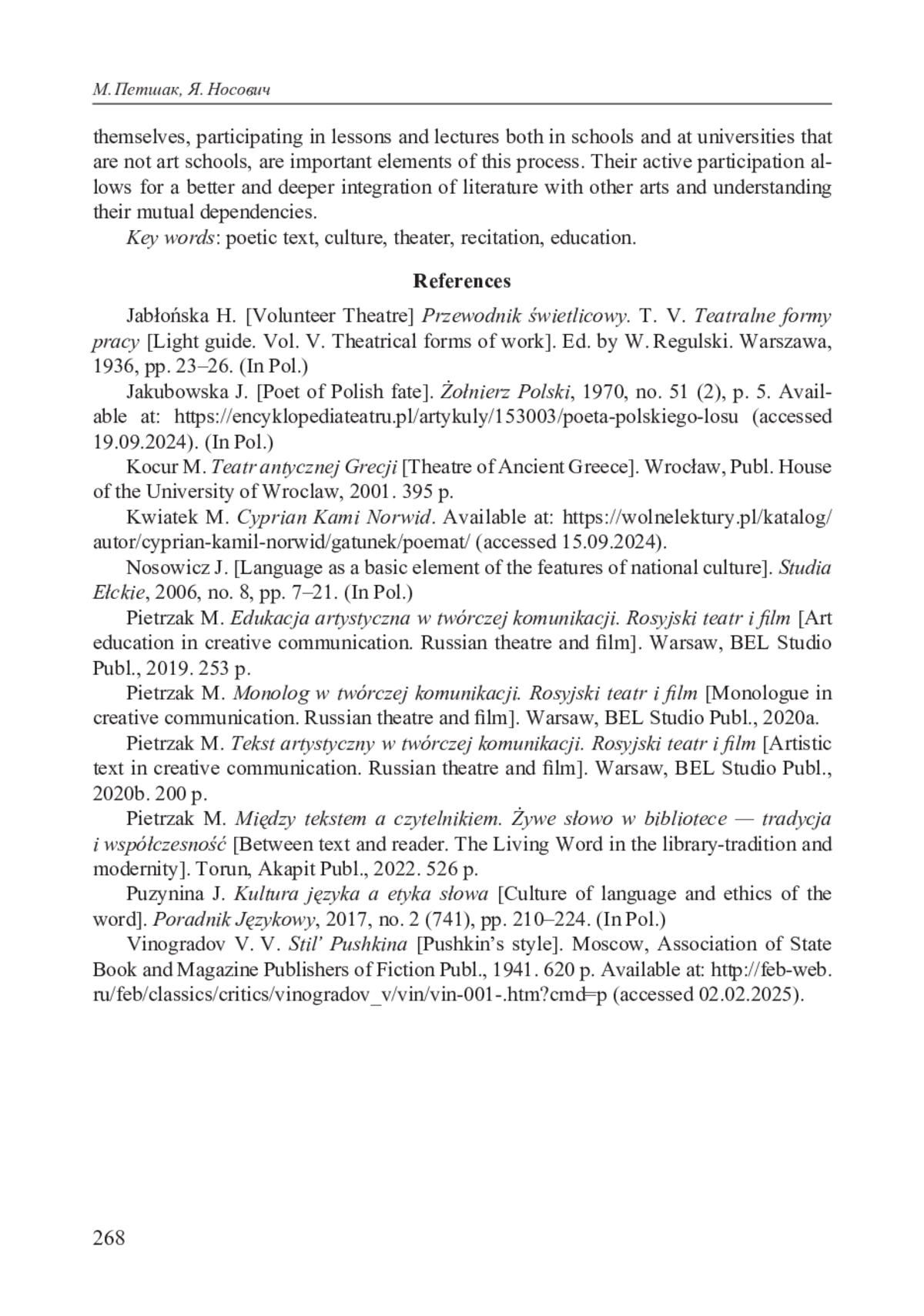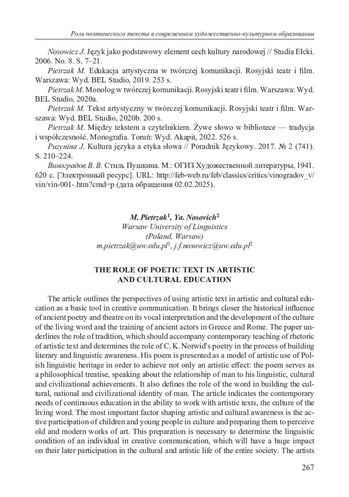 9. Pietrzak M. Tekst artystyczny w twórczej komunikacji. Rosyjski teatr i film. Warszawa: Wyd. BEL Studio, 2020b. 200 s.