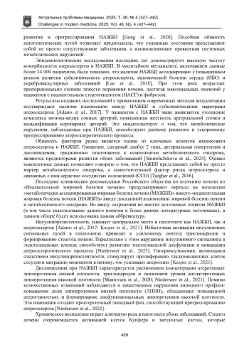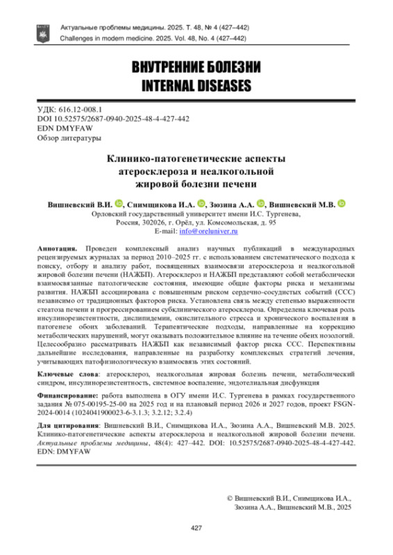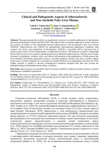 Проведен комплексный анализ научных публикаций в международных рецензируемых журналах за период 2010–2025 гг. с использованием систематического подхода к поиску, отбору и анализу работ, посвященных взаимосвязи атеросклероза и неалкогольной жировой болезни печени (НАЖБП). Атеросклероз и НАЖБП представляют собой метаболически взаимосвязанные патологические состояния, имеющие общие факторы риска и механизмы развития. НАЖБП ассоциирована с повышенным риском сердечно-сосудистых событий (ССС) независимо от традиционных факторов риска. Установлена связь между степенью выраженности стеатоза печени и прогрессированием субклинического атеросклероза. Определена ключевая роль инсулинорезистентности, дислипидемии, окислительного стресса и хронического воспален ия в патогенезе обоих заболеваний. Терапевтические подходы, направленные на коррекцию метаболических нарушений, могут оказывать положительное влияние на течение обеих нозологий. Целесообразно рассматривать НАЖБП как независимый фактор риска ССС. Перспектив ны дальнейшие исследования, направленные на разработку комплексных стратегий лечения, учитывающих патофизиологическую взаимосвязь этих состояний.