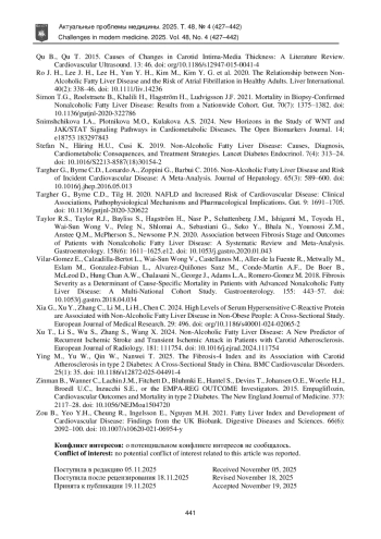 46. Xu T., Li S., Wu S., Zhang S., Wang X. 2024. Non-Alcoholic Fatty Liver Disease: A New Predictor of Recurrent Ischemic Stroke and Transient Ischemic Attack in Patients with Carotid Atherosclerosis. European Journal of Radiology. 181: 111754. DOI: 10.1016/j.ejrad.2024.111754 EDN: FGPYGZ