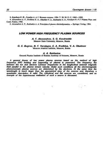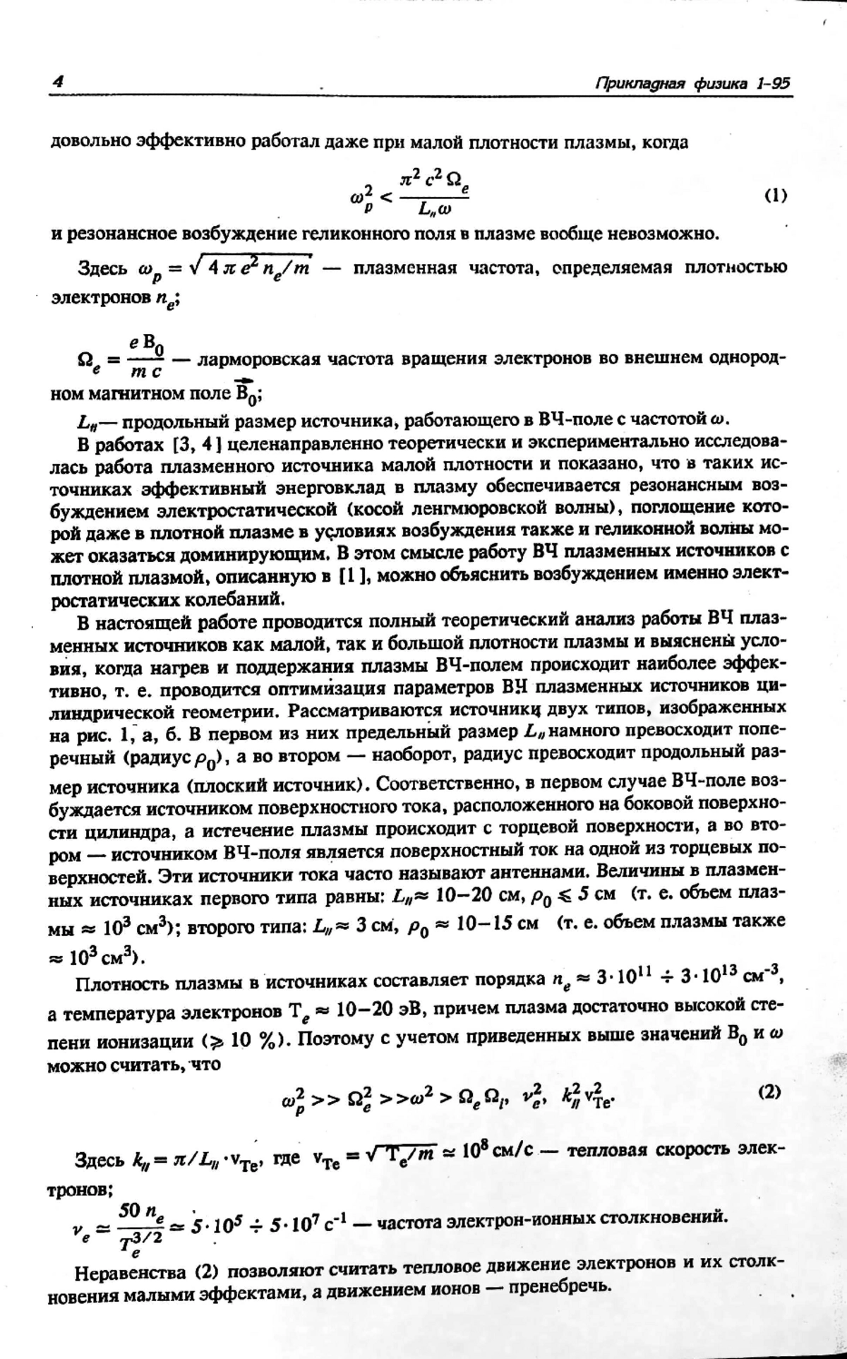 Изложена общая теория плазменных источников малой мощности, основанных на высокочастотном (ВЧ) методе нагрева и поддержания плазмы. Частота ВЧ-поля лежит между ионной и электронной ленгмюровскими и циклотронными частотами во внешнем продольном магнитном поле, параллельном скорости истечения плазмы. В этих условиях процессы проникновения и поглощения ВЧ-поля в плазму определяются чисто электронной компонентой плазмы. Вместе с тем длина волны ВЧ-поля в вакууме намного превосходит геометрические размеры источника, что позволяет использовать квазистатическое (неволновое) приближение. Рассмотрены примеры цилиндрического и плоского источников плазмы, а также экспериментальной реализации такого источника