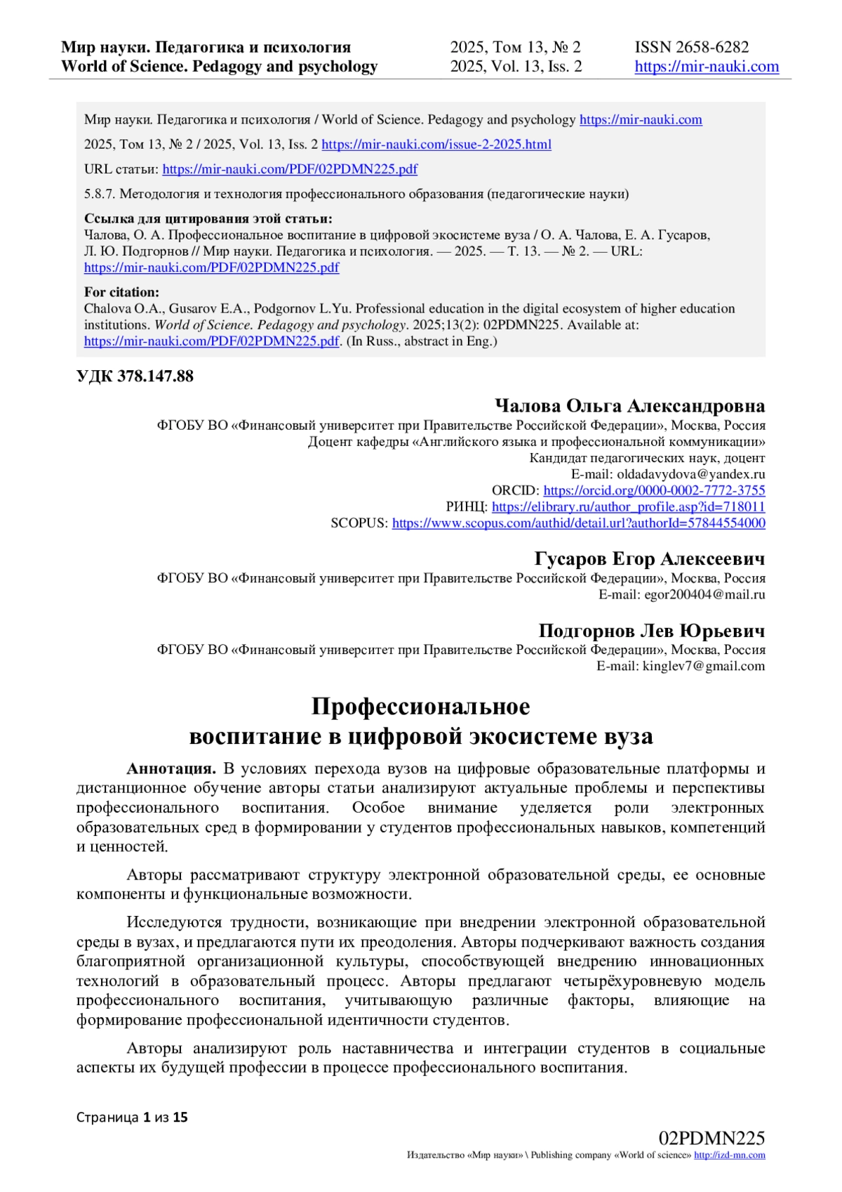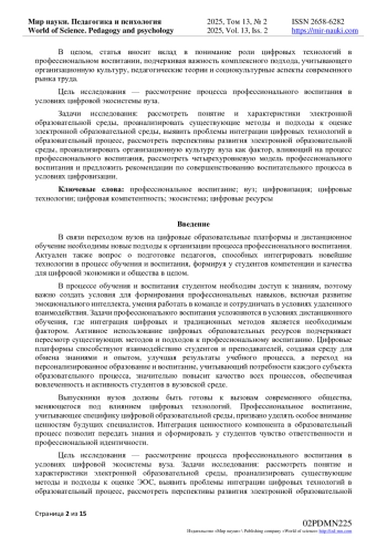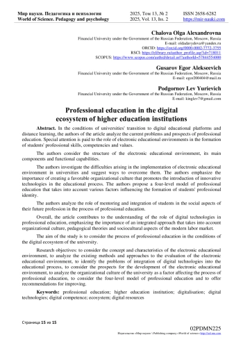 В условиях перехода вузов на цифровые образовательные платформы и дистанционное обучение авторы статьи анализируют актуальные проблемы и перспективы профессионального воспитания. Особое внимание уделяется роли электронных образовательных сред в формировании у студентов профессиональных навыков, компетенций и ценностей. Авторы рассматривают структуру электронной образовательной среды, ее основные компоненты и функциональные возможности. Исследуются трудности, возникающие при внедрении электронной образовательной среды в вузах, и предлагаются пути их преодоления. Авторы подчеркивают важность создания благоприятной организационной культуры, способствующей внедрению инновационных технологий в образовательный процесс. Авторы предлагают четырёхуровневую модель профессионального воспитания, учитывающую различные факторы, влияющие на формирование профессиональной идентичности студентов. Авторы анализируют роль наставничества и интеграции студентов в социальные аспекты их будущей профессии в процессе профессионального воспитания. В целом, статья вносит вклад в понимание роли цифровых технологий в профессиональном воспитании, подчеркивая важность комплексного подхода, учитывающего организационную культуру, педагогические теории и социокультурные аспекты современного рынка труда.