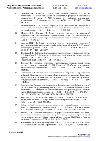 12. Жадобина, Н.Н. Цифровая образовательная среда: проблемы и их решения в вузе / Н.Н. Жадобина, Е.В. Лукиянчина // Международный научно-исследовательский журнал. - 2021. - № 10-3(112). - С. 27-32. DOI: 10.23670/IRJ.2021.112.10.069 EDN: KXGGAN