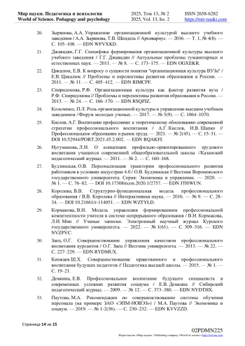 25. Кислов, А.Г. Воспитание профессиями: к теоретическому обоснованию современной стратегии профессионального воспитания / А.Г. Кислов, И.В. Шапко // Профессиональное образование и рынок труда. - 2021. - № 2(45). - С. 15-31. DOI: 10.52944/PORT.2021.45.2.002 EDN: RQAKFI