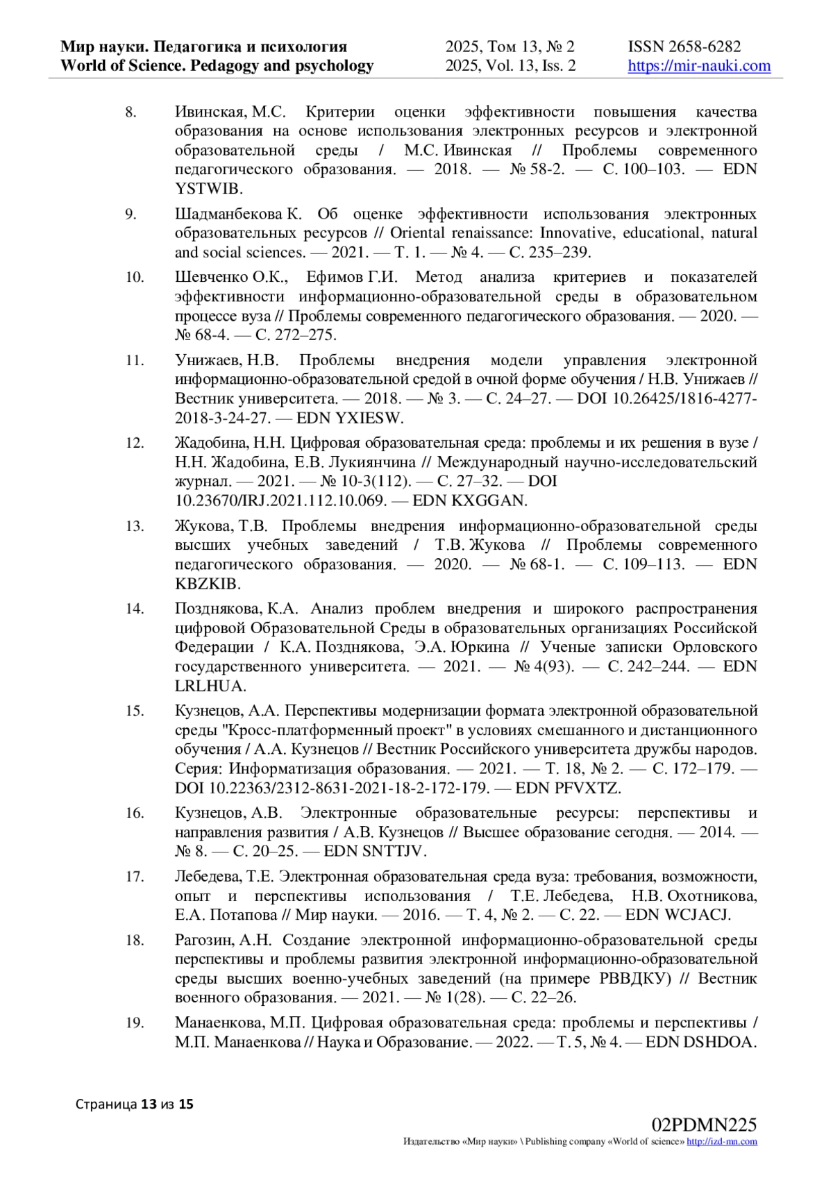 10. Шевченко О.К., Ефимов Г.И. Метод анализа критериев и показателей эффективности информационно-образовательной среды в образовательном процессе вуза // Проблемы современного педагогического образования. - 2020. - № 68-4. - С. 272-275. EDN: JODTTI