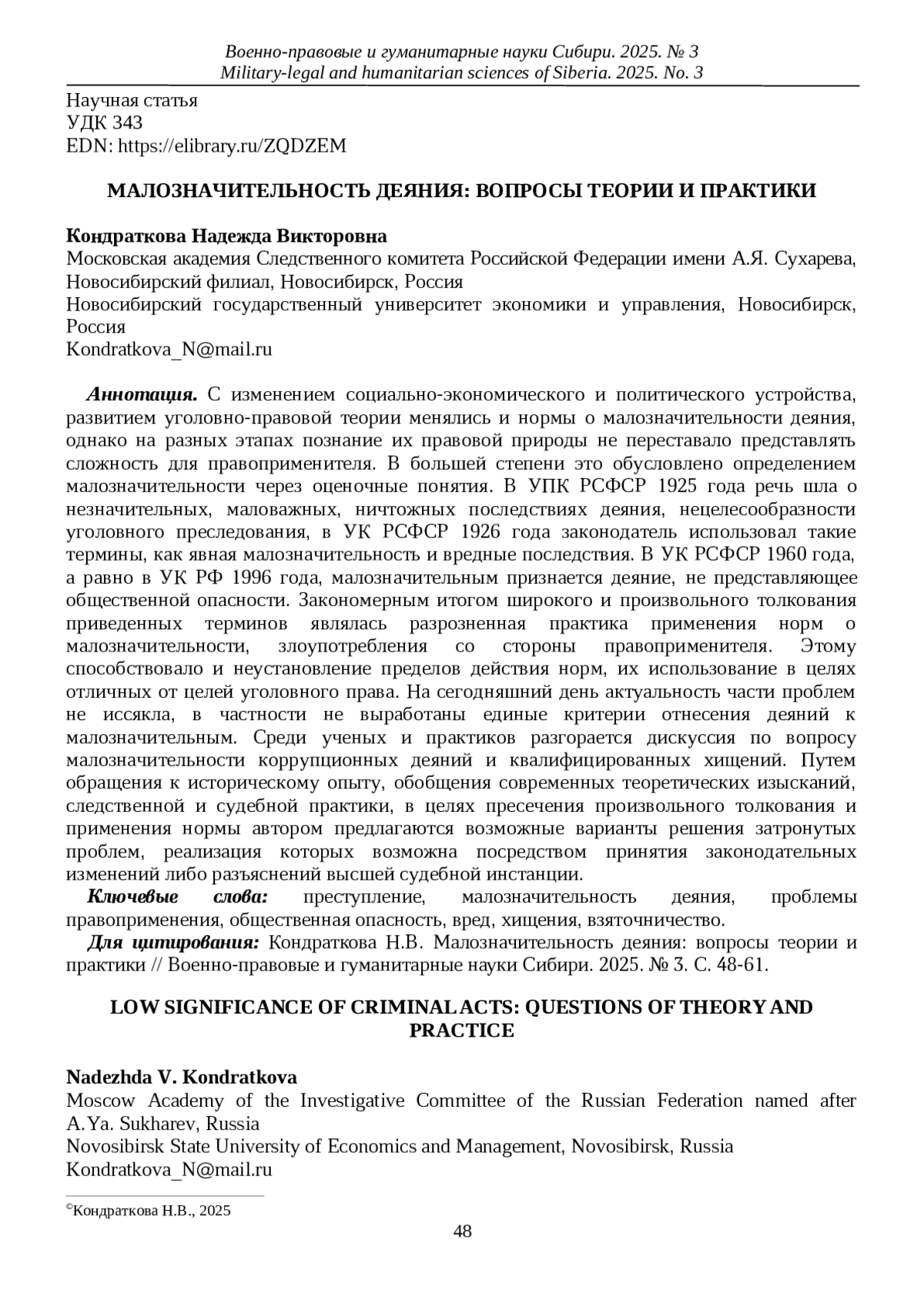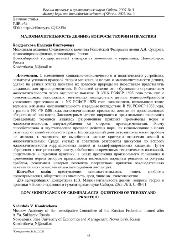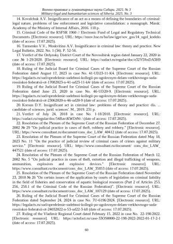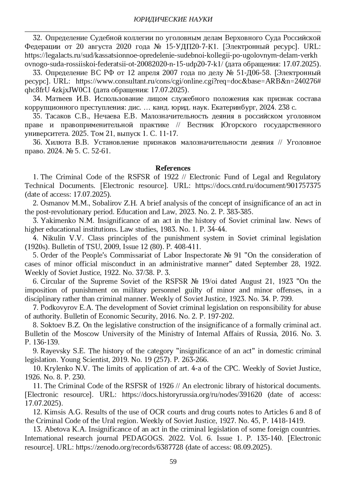 35. Тасаков С.В., Нечаева Е.В. Малозначительность деяния в российском уголовном праве и правоприменительной практике // Вестник Югорского государственного университета. 2025. Том 21, выпуск 1. С. 11-17. EDN: PWNXMZ