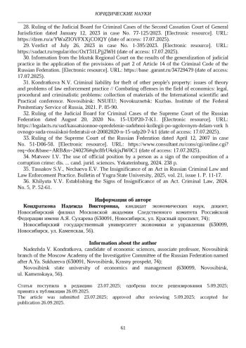 31. Кондраткова Н.В. Уголовная ответственность за хищения чужого имущества: вопросы теории и проблемы правоприменительной практики // Борьба с правонарушениями в сфере экономики: правовые, процессуальные и криминалистические проблемы: сб. мат-лов междунар. науч.-практ. конф. Новосибирск: НГУЭУ; Новокузнецк: Кузбас. ин-т ФСИН России, 2021. С. 85-90. EDN: AAUUUY