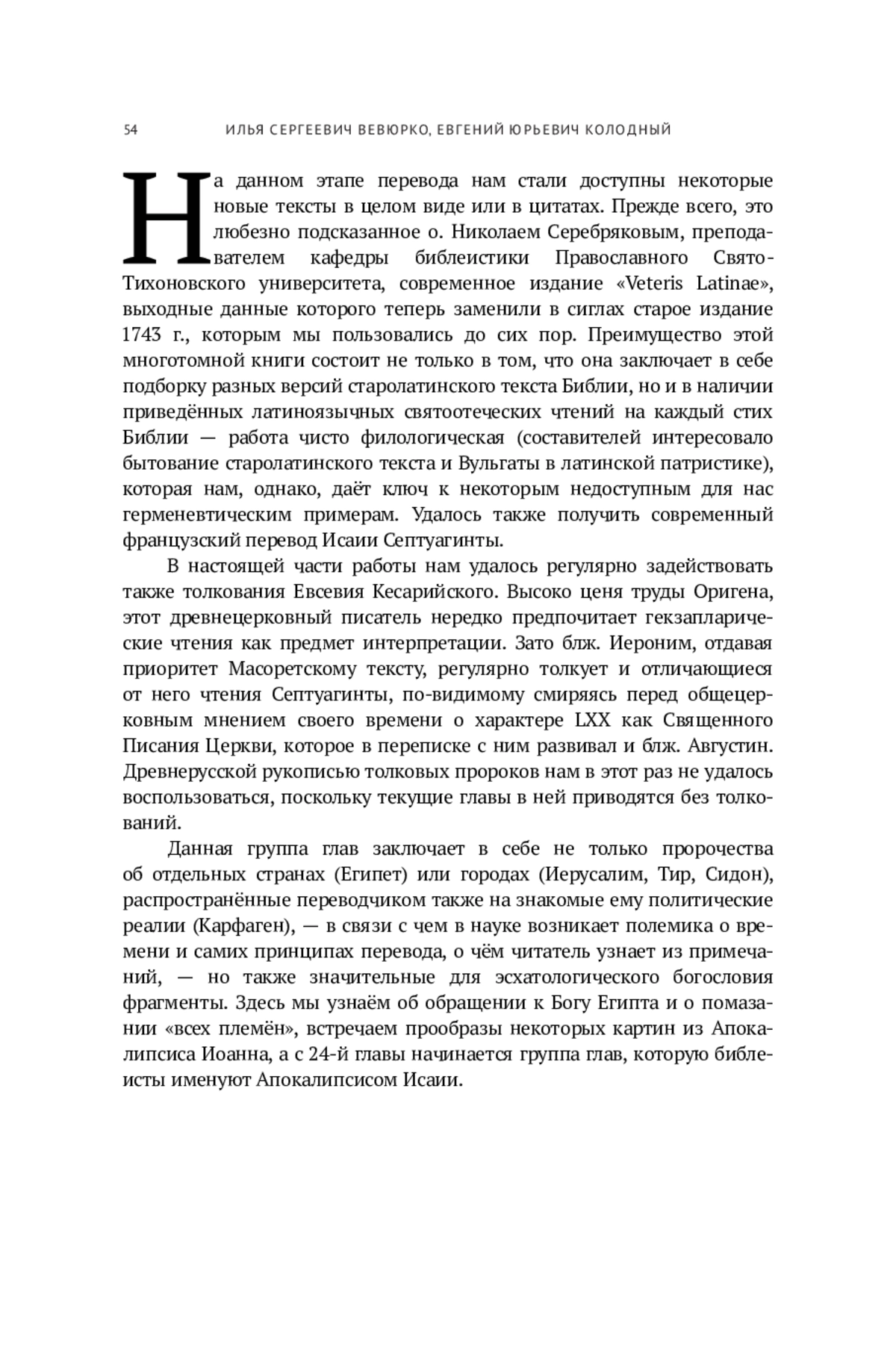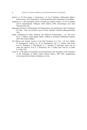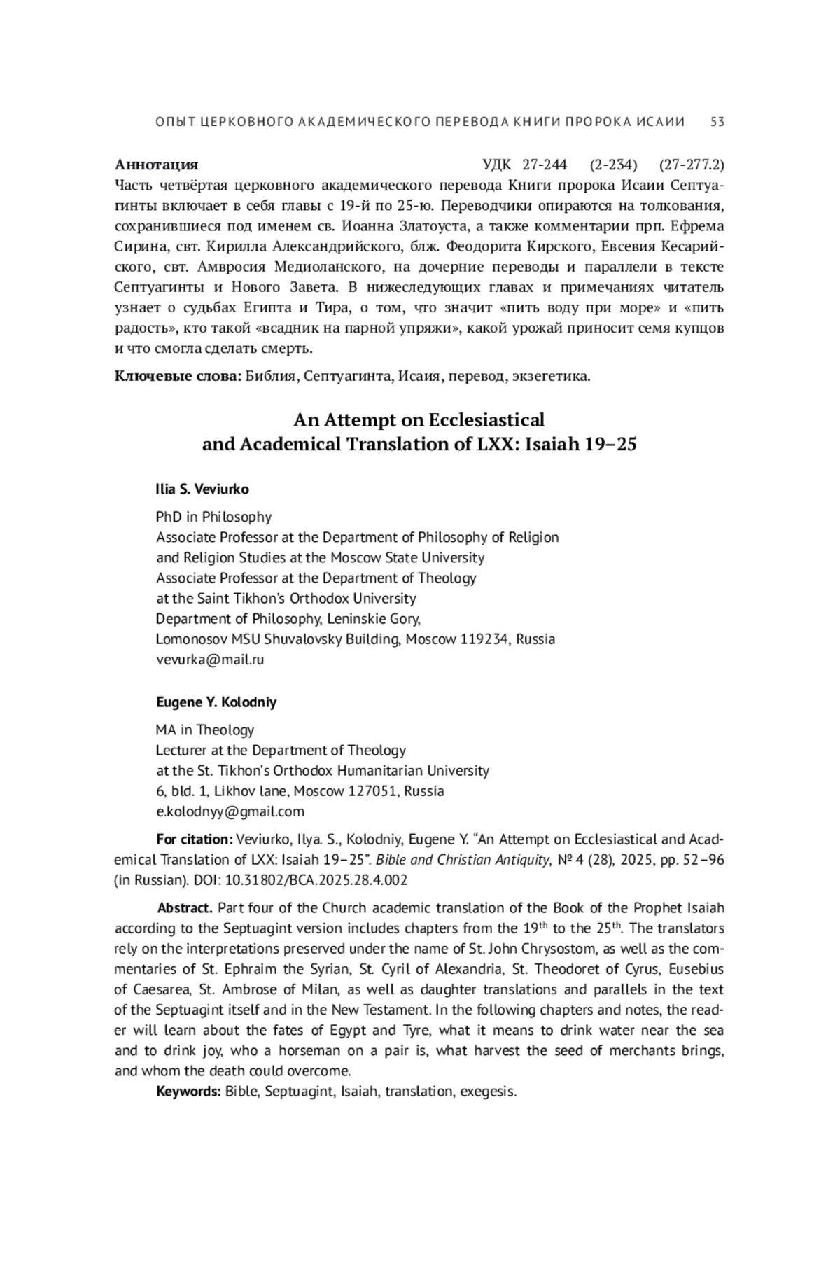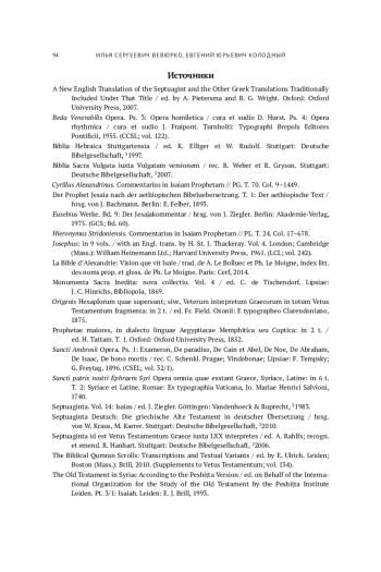 30. Вевюрко И. С., Колодный Е. Ю. Опыт церковного академического перевода Книги пророка Исаии по LXX. Главы 7-12 // Библия и христианская древность. 2025. № 2 (26). С. 97-133. EDN: WJYJRF