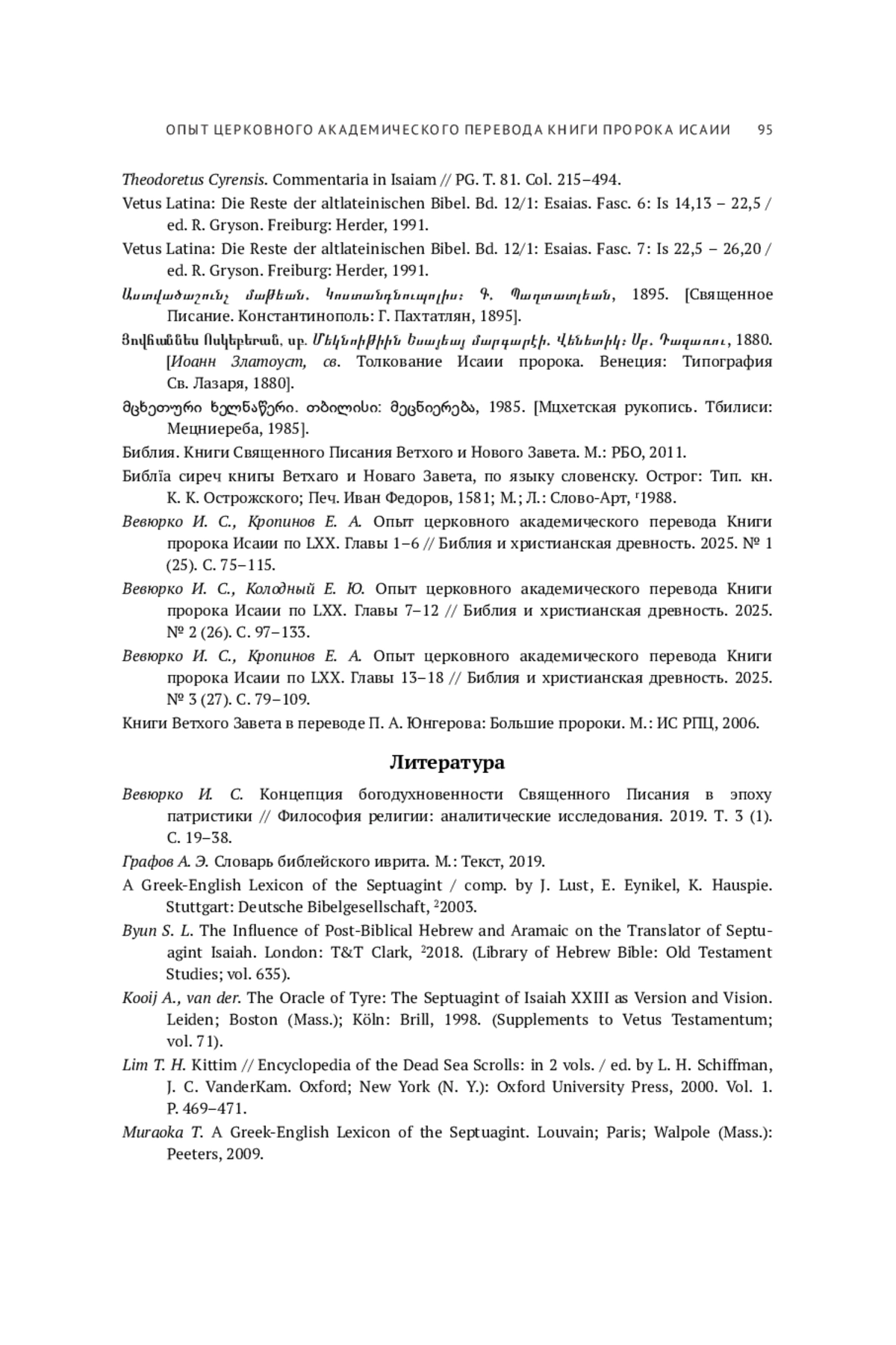 29. Вевюрко И. С., Кропинов Е. А. Опыт церковного академического перевода Книги пророка Исаии по LXX. Главы 1-6 // Библия и христианская древность. 2025. № 1 (25). С. 75-115. EDN: AAXNGK