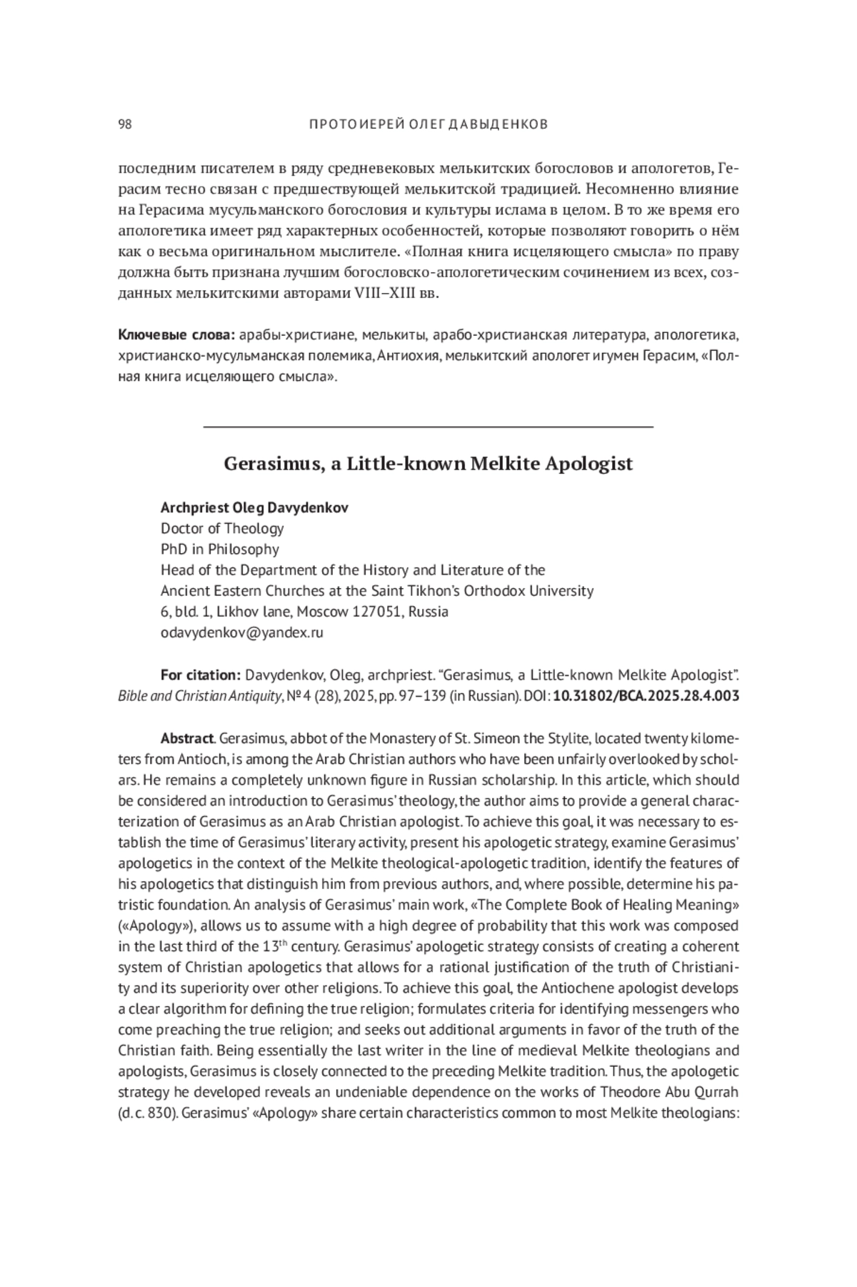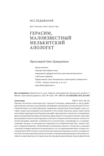 Герасим, настоятель монастыря прп. Симеона Столпника, принадлежит к числу арабо-христианских авторов, незаслуженно обойдённых вниманием исследователей. В отечественной науке он остаётся фигурой совершенно неизвестной. В настоящей статье, которую следует рассматривать как введение в богословие Герасима, автор ставит целью дать общую характеристику Герасима как арабо-христианского апологета: устанавливает время литературной активности Герасима, представляет его апологетическую стратегию, рассматривает апологетику Герасима в контексте мелькитской богословско-апологетической традиции, выявляет особенности его апологетики, отличающие его от предшествующих авторов, по возможности определяет его патристическую базу. Анализ главного сочинения Герасима, «Полной книги исцеляющего смысла» («Апологии»), позволяет с высокой степенью вероятности предполагать, что это произведение было создано в последней трети XIII столетия. Апологетическая стратегия Герасима состоит в создании целостной системы христианской апологетики, позволяющей рационально обосновать истинность христианства и его превосходство над другими религиями. Будучи фактически последним писателем в ряду средневековых мелькитских богословов и апологетов, Герасим тесно связан с предшествующей мелькитской традицией. Несомненно влияние на Герасима мусульманского богословия и культуры ислама в целом. В то же время его апологетика имеет ряд характерных особенностей, которые позволяют говорить о нём как о весьма оригинальном мыслителе. «Полная книга исцеляющего смысла» по праву должна быть признана лучшим богословско-апологетическим сочинением из всех, созданных мелькитскими авторами VIII-XIII вв.