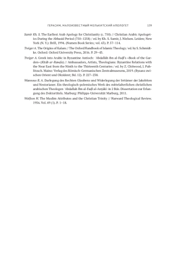 45. Samir Kh. S. The Earliest Arab Apology for Christianity (c. 750) // Christian Arabic Apologetics During the Abbasid Period (750-1258) / ed. by Kh. S. Samir, J. Nielsen. Leiden; New York (N. Y.): Brill, 1994. (Numen Book Series; vol. 63). P. 57-114.