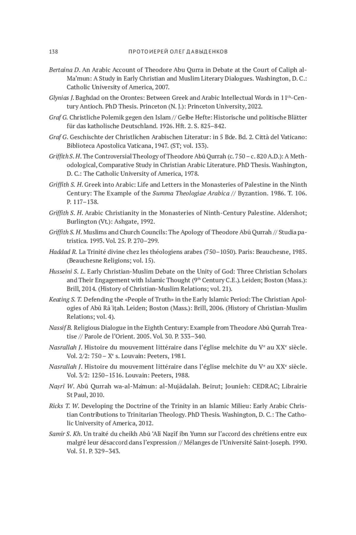 39. Nassif B. Religious Dialogue in the Eighth Century: Example from Theodore Abū Qurrah Treatise // Parole de l’Orient. 2005. Vol. 30. P. 333-340.