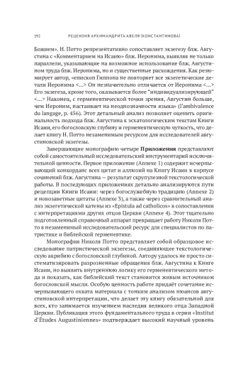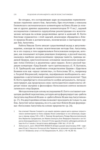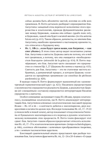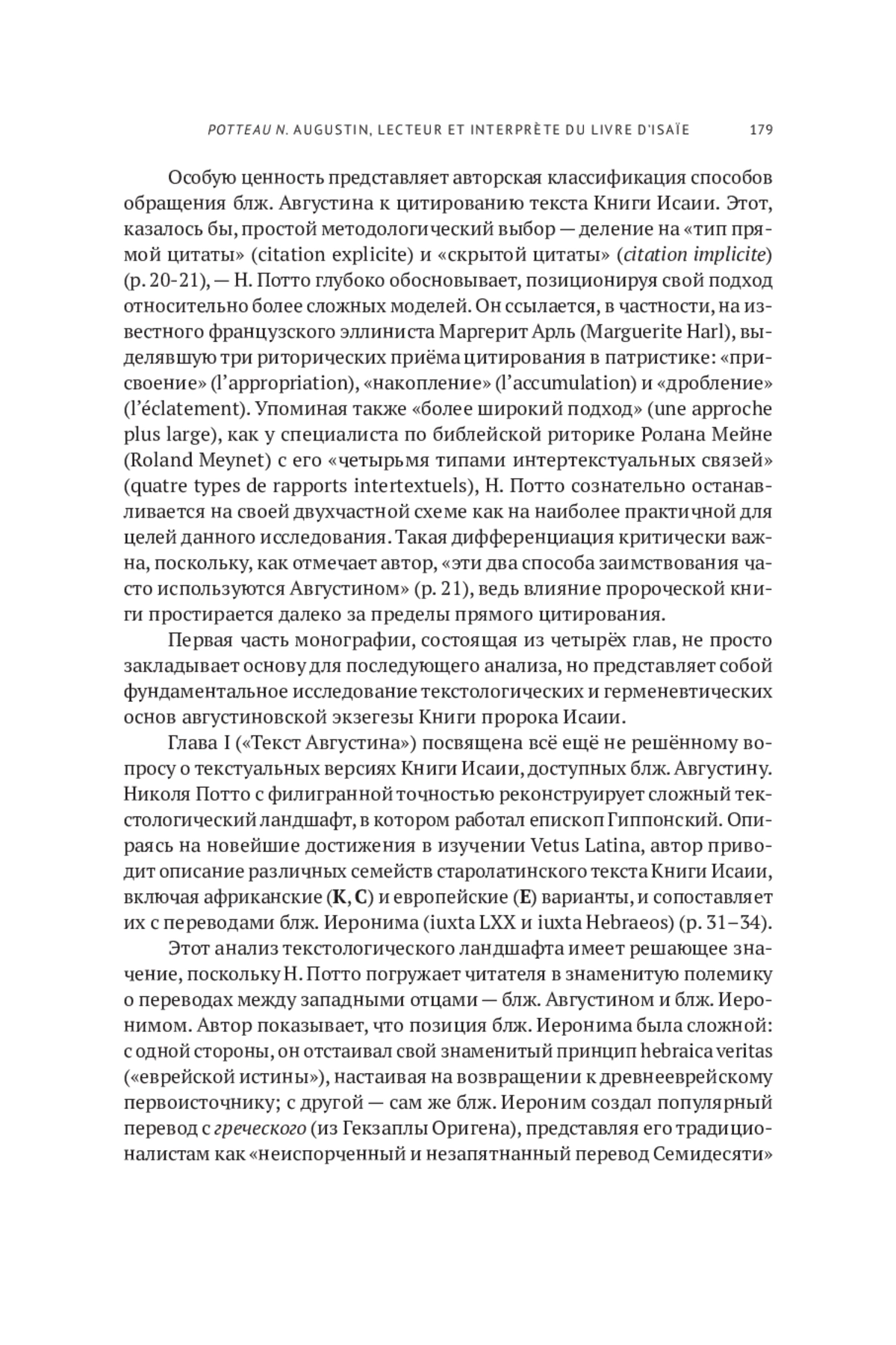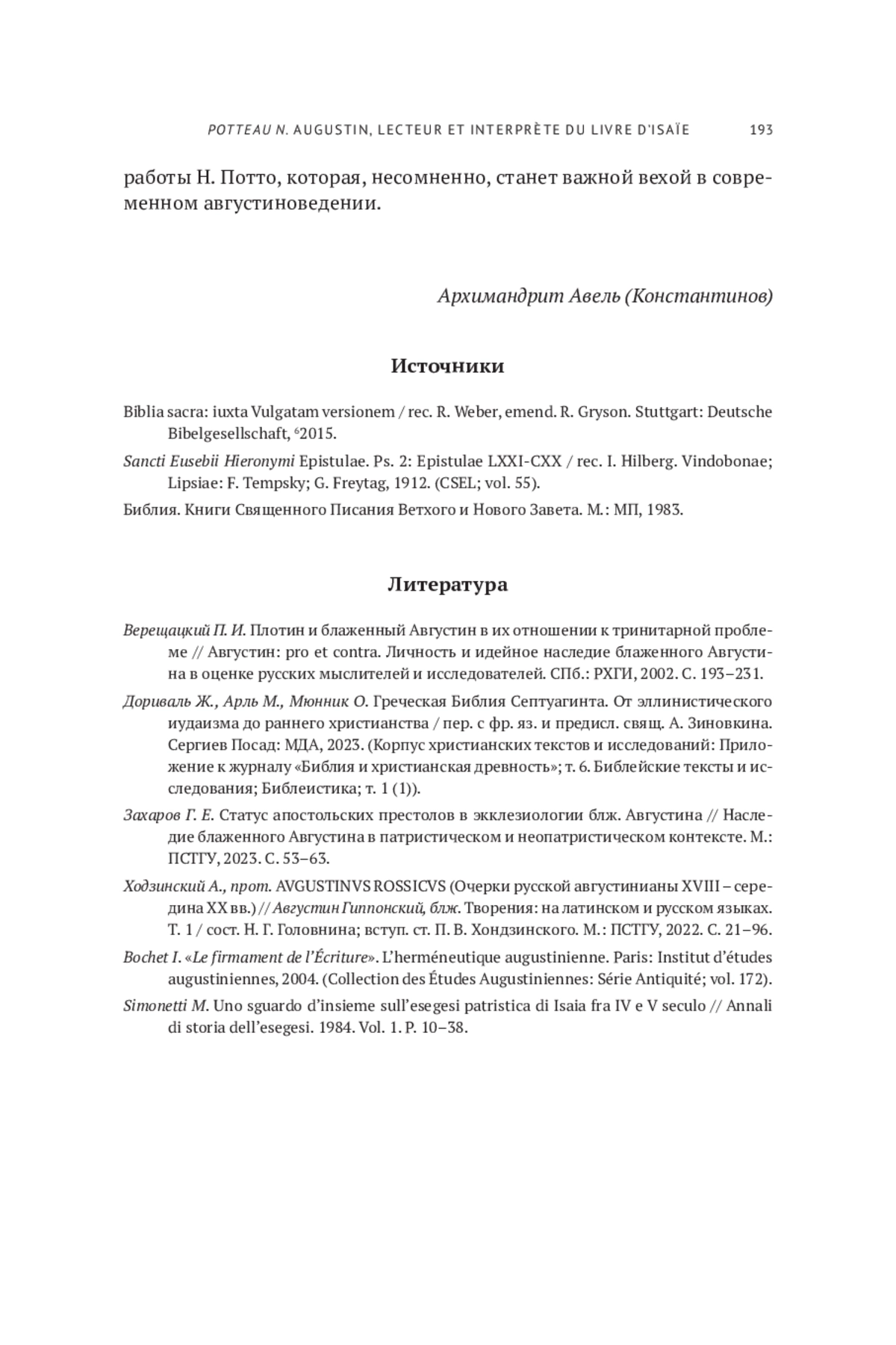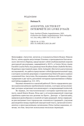 Монография «Августин, читатель и толкователь Книги Исаии» Николя Потто, члена ордена августинцев Успения и преподавателя Католического института Парижа, представляет собой опубликованную версию докторской диссертации, защищённой в 2019 г. в Centre Sèvres (ныне Facultés Loyola Paris) под руководством Изабель Боше (Isabelle Bochet). Изданная в престижной серии «Série Antiquité» Института августинских исследований, эта работа представляет собой фундаментальный труд, в котором изучению рецепция и герменевтика Книги Исаии в корпусе сочинений блж. Августина. Исследование объёмом 600 страниц структурировано в две части, дополнено четырьмя приложениями и обширной библиографией (p. 515–537).