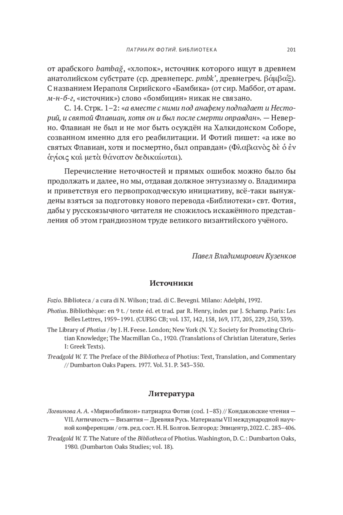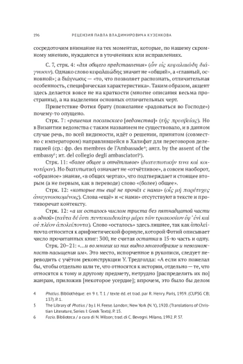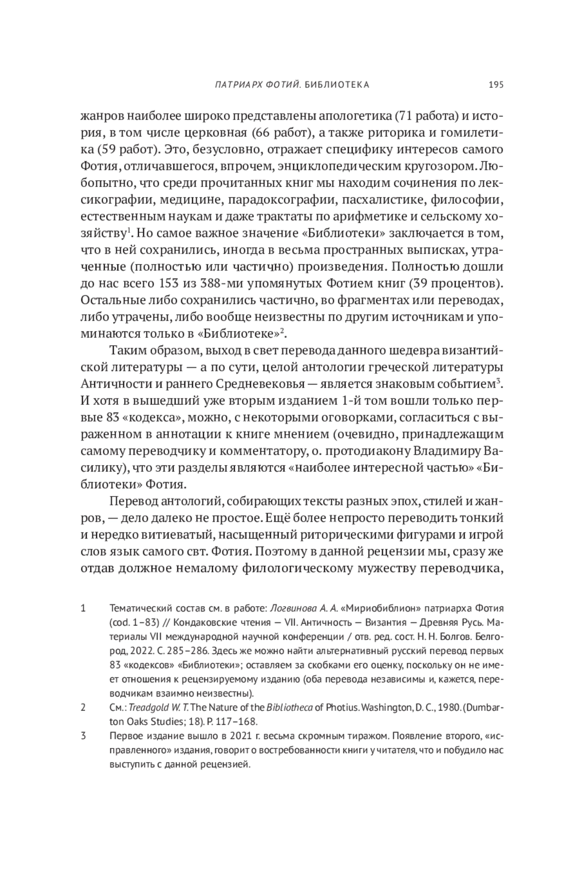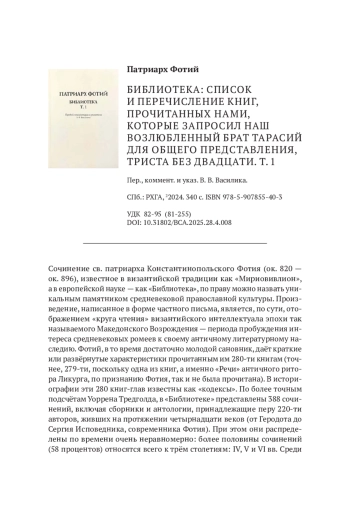 Сочинение св. патриарха Константинопольского Фотия (ок. 820 — ок. 896), известное в византийской традиции как «Мириовивлион», а в европейской науке — как «Библиотека», по праву можно назвать уникальным памятником средневековой православной культуры. Произведение, написанное в форме частного письма, является, по сути, отображением «круга чтения» византийского интеллектуала эпохи так называемого Македонского Возрождения — периода пробуждения интереса средневековых ромеев к своему античному литературному наследию. Фотий, в то время достаточно молодой сановник, даёт краткие или развёрнутые характеристики прочитанным им 280-ти книгам (точнее, 279-ти, поскольку одна из книг, а именно «Речи» античного ритора Ликурга, по признанию Фотия, так и не была прочитана). В историографии эти 280 книг-глав известны как «кодексы». По более точным подсчётам Уоррена Тредголда, в «Библиотеке» представлены 388 сочинений, включая сборники и антологии, принадлежащие перу 220-ти авторов, живших на протяжении четырнадцати веков (от Геродота до Сергия Исповедника, современника Фотия). При этом они распределены по времени очень неравномерно: более половины сочинений (58 процентов) относятся всего к трём столетиям: IV, V и VI вв. Среди жанров наиболее широко представлены апологетика (71 работа) и история, в том числе церковная (66 работ), а также риторика и гомилетика (59 работ). Это, безусловно, отражает специфику интересов самого Фотия, отличавшегося, впрочем, энциклопедическим кругозором. Любопытно, что среди прочитанных книг мы находим сочинения по лексикографии, медицине, парадоксографии, пасхалистике, философии, естественным наукам и даже трактаты по арифметике и сельскому хозяйству1. Но самое важное значение «Библиотеки» заключается в том, что в ней сохранились, иногда в весьма пространных выписках, утраченные (полностью или частично) произведения. Полностью дошли до нас всего 153 из 388-ми упомянутых Фотием книг (39 процентов). Остальные либо сохранились частично, во фрагментах или переводах, либо утрачены, либо вообще неизвестны по другим источникам и упоминаются только в «Библиотеке»2.