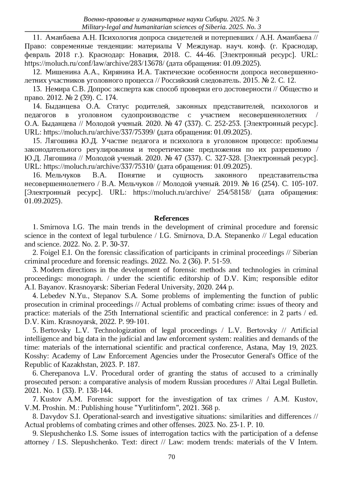 11. Аманбаева А.Н. Психология допроса свидетелей и потерпевших / А.Н. Аманбаева // Право: современные тенденции: материалы V Междунар. науч. конф. (г. Краснодар, февраль 2018 г.). Краснодар: Новация, 2018. С. 44-46. [Электронный ресурс]. URL: https://moluch.ru/conf/law/archive/283/13678/(дата обращения: 01.09.2025). EDN: YOWDZI